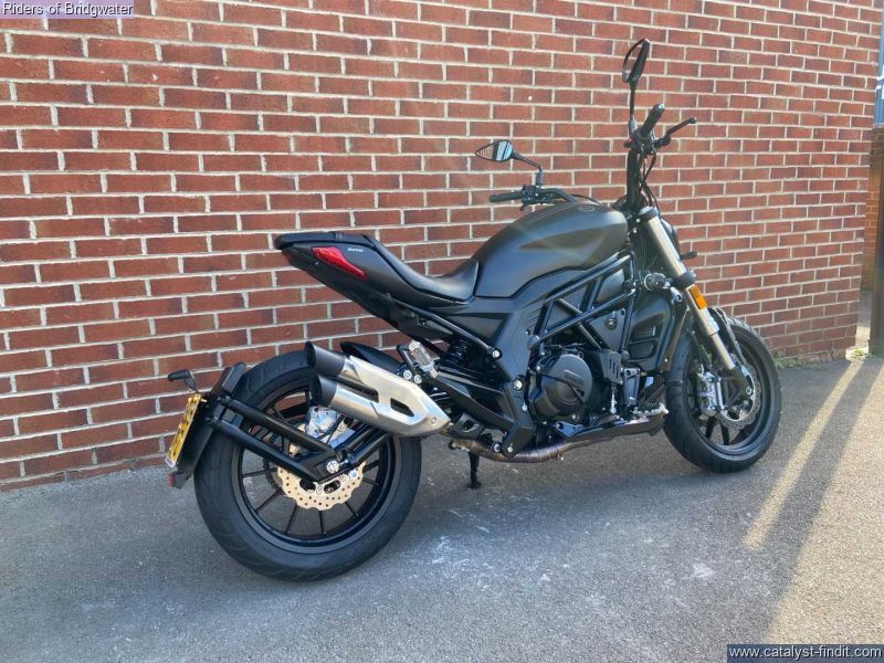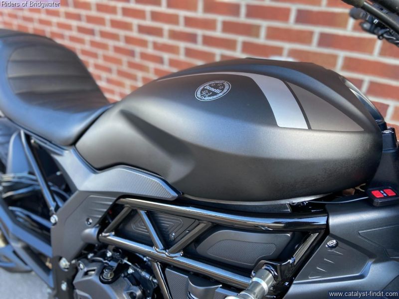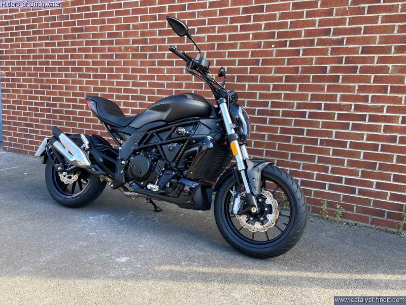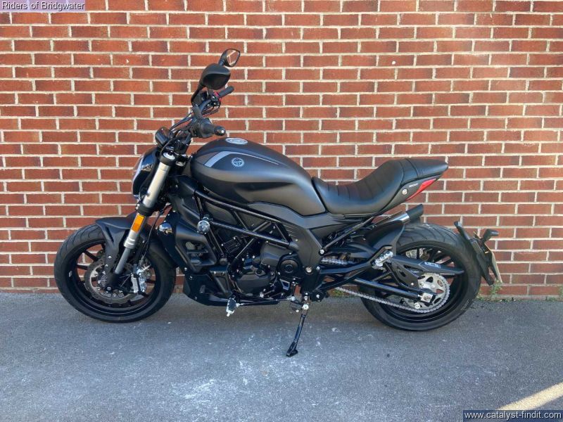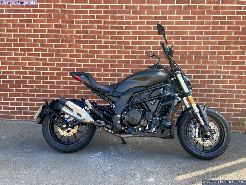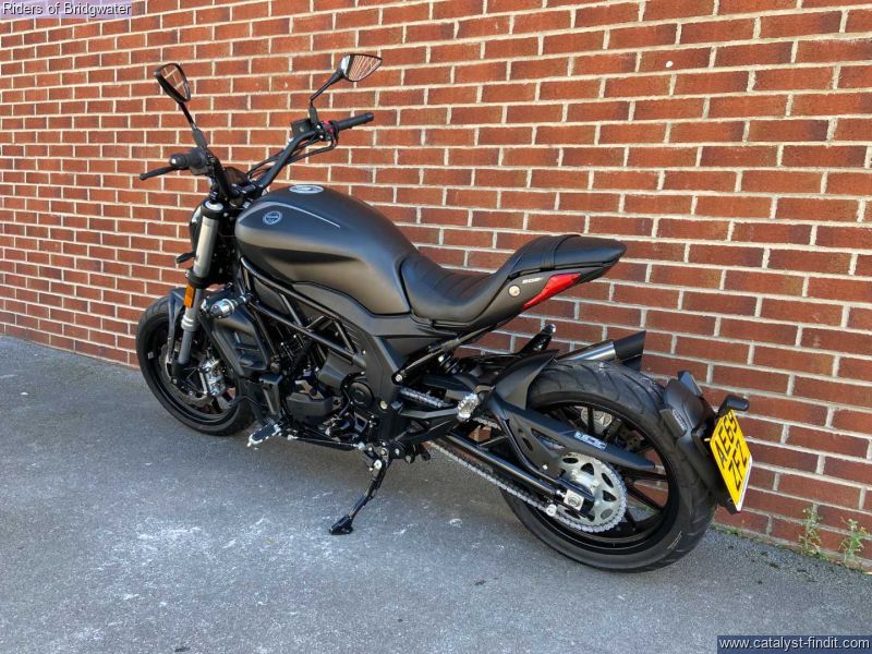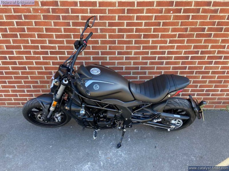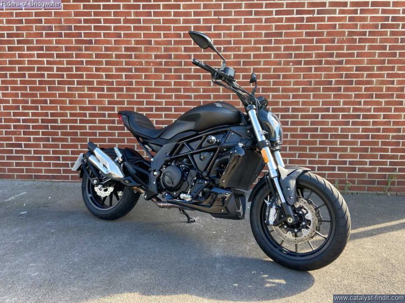 - Great example of the Benelli 502 Custom model in black. This bike boasts performance cruiser styling and riding position, ABS brakes with radial calipers, forward foot-controls, crash bungs, digital dash with front & rear cameras! Open pipe for a fruity soundtrack.