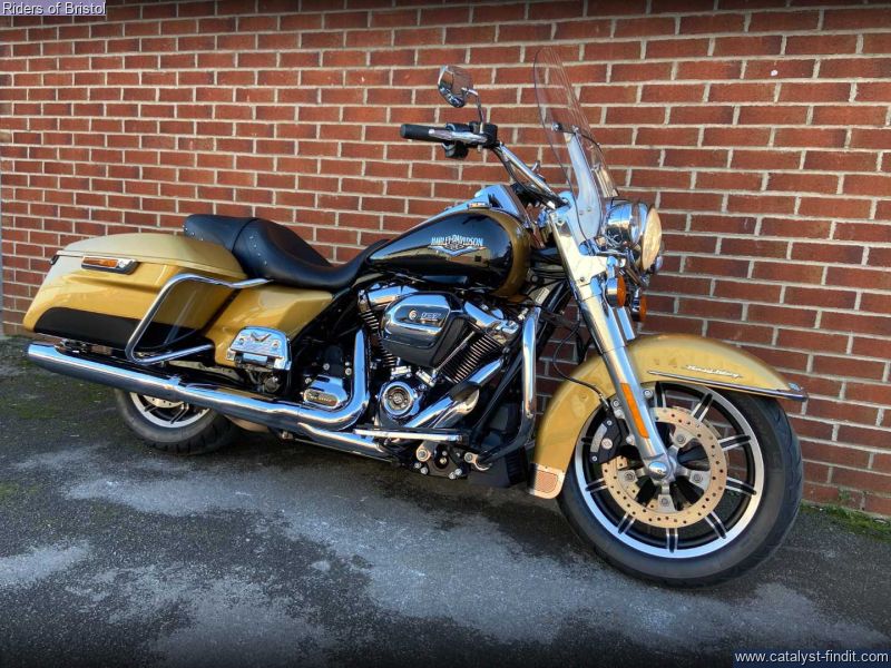 - Harley-Davidson FLHR Road King in gold and black two-tone, 1745cc Milwaukee 8 engine, six speed transmission, heated grips, rear pannier light, a great looking touring machine.
