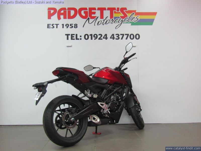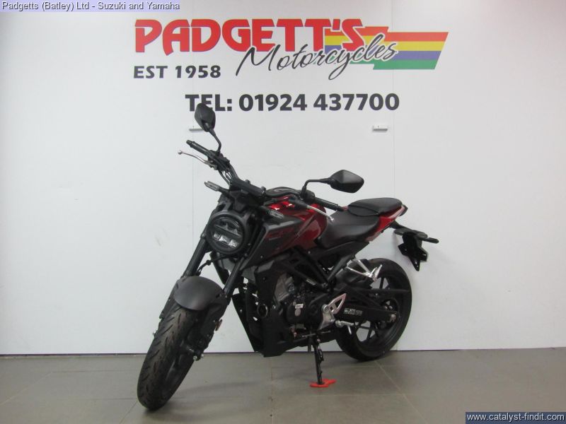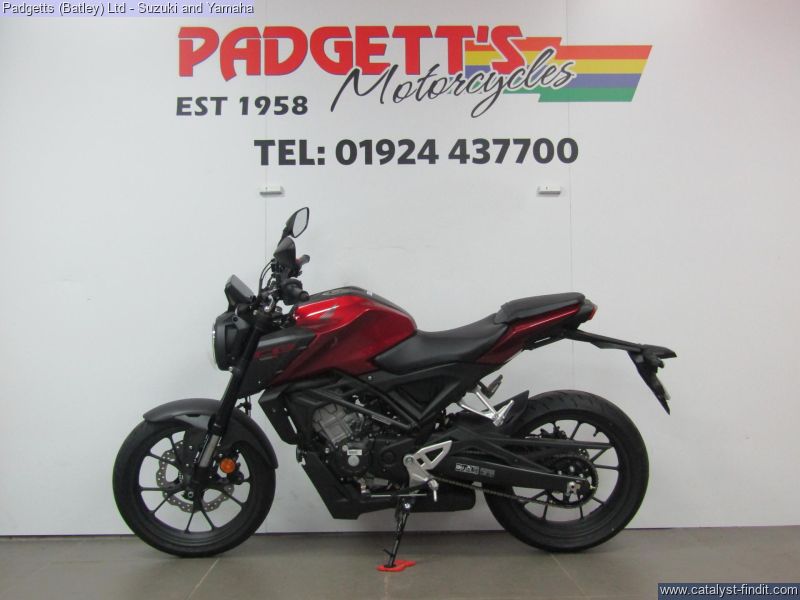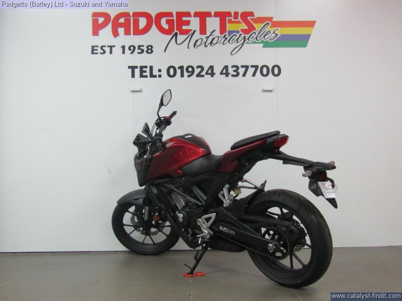 - We present here for sale this Honda CB125R. The CB125R packs concentrated performance into a stylish silhouette, offering an exciting riding experience for new riders. A small sibling of the awesome CB1000R – and therefore a member of the Neo Sports Café family – it makes an instant statement with bold styling enfolding a tubular steel frame. A state- of-the-art LCD dash and full LED lighting are premium features, but what will really get your attention is the extra power of the new 125cc DOHC engine and suspension precision of Showa SFF-BP USD forks. With an emphasis on minimalism, the more you ride the CB125R, the more your confidence will grow. While its compact size makes it easy to manage, its big bike features ensure it’s the perfect introduction to real-world motorcycling. The all-new, DOHC 4V single-cylinder engine produces an extra 1.2kW and 1.6Nm peak power and torque driving through a slick-changing, six-speed gearbox. Matching the engine upgrade are 41mm Showa SFF-BP USD front forks – a high-quality specification you’ll find on our bigger bikes – that deliver pinpoint control and steering, alongside full-size tyres and radial- mount front brake caliper with Inertial Measurement Unit (IMU) ABS management. If you’re ready to go to the next level, this is it. The bike is available for viewing and is well worth a look. Finance is available and is subject to status. Nationwide delivery can be arranged from as little as £60. Usual Dealer facilities including a Large range of clothing, helmets & accessories. Call Padgett's Motorcycles today to ensure that you don't miss out; Suzuki Sales Centre 01924 609808, Honda Sales Centre 01924 437700 and Yamaha Sales Centre 01924 478491.