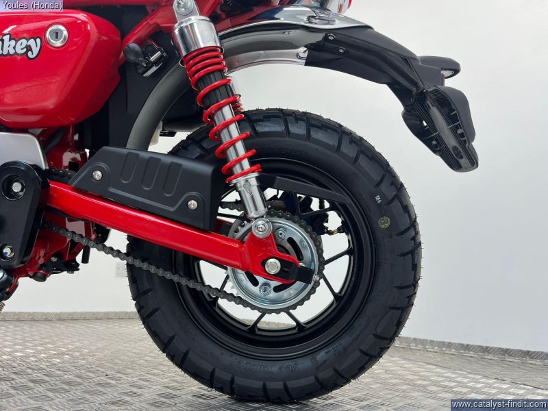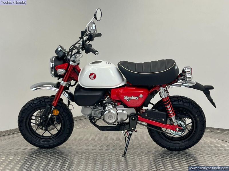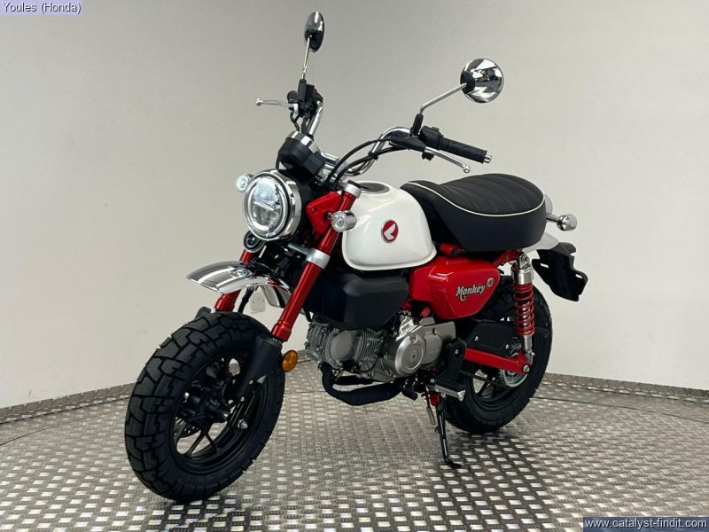 - There’s nothing else quite like a Monkey. It has style all of its own. And character like nothing else. Chromed high- rise handlebars, plus frame, swingarm and shock absorbers painted the same colour – and the high-level mudguards – all draw attention, as do the chunky block-section tyres. But underneath it has a brand-new, fuel-efficient air-cooled 125cc engine and 5-speed gearbox bolted into a sturdy chassis that features IMU-controlled ABS braking. It’s also small and light, just 104kg, with a comfy seat set just 775mm from the ground. A small bike with a big heart, built to put the fun in your function. That’s Monkey.