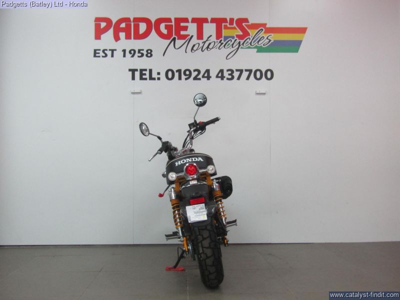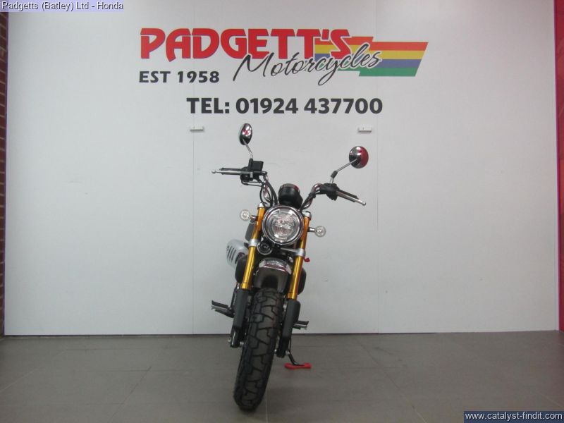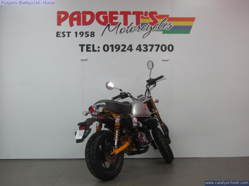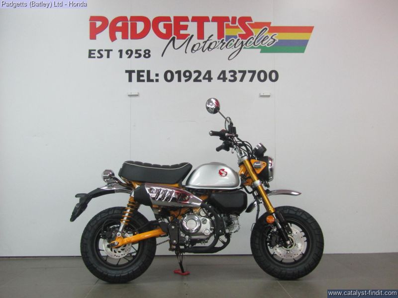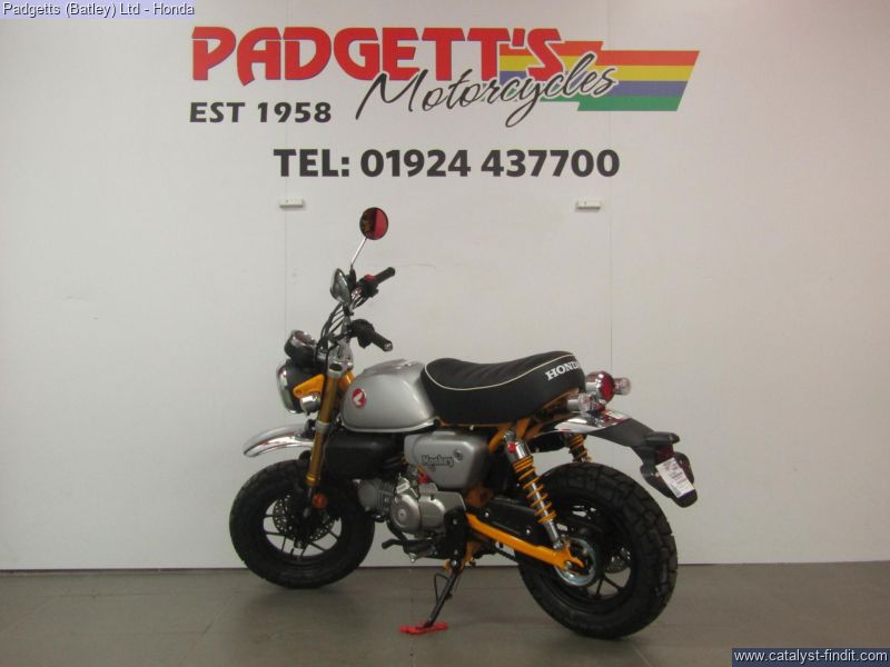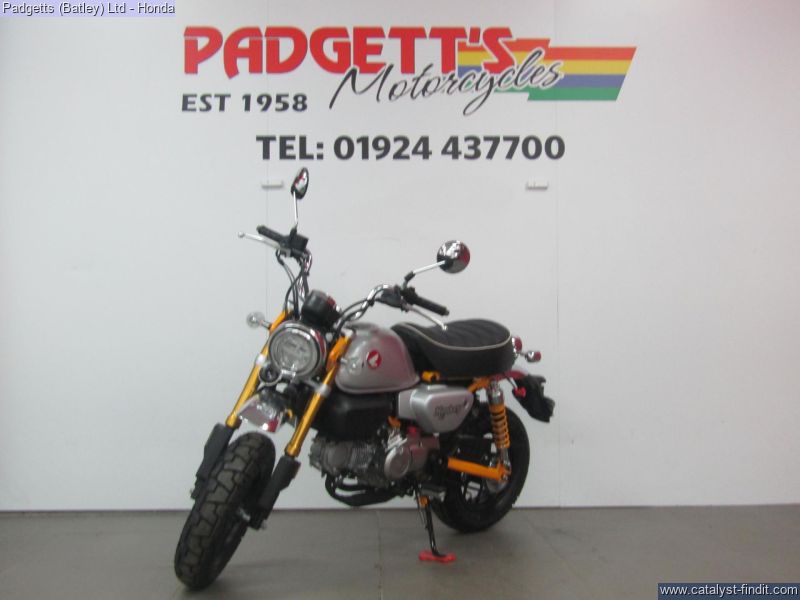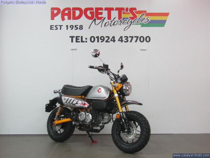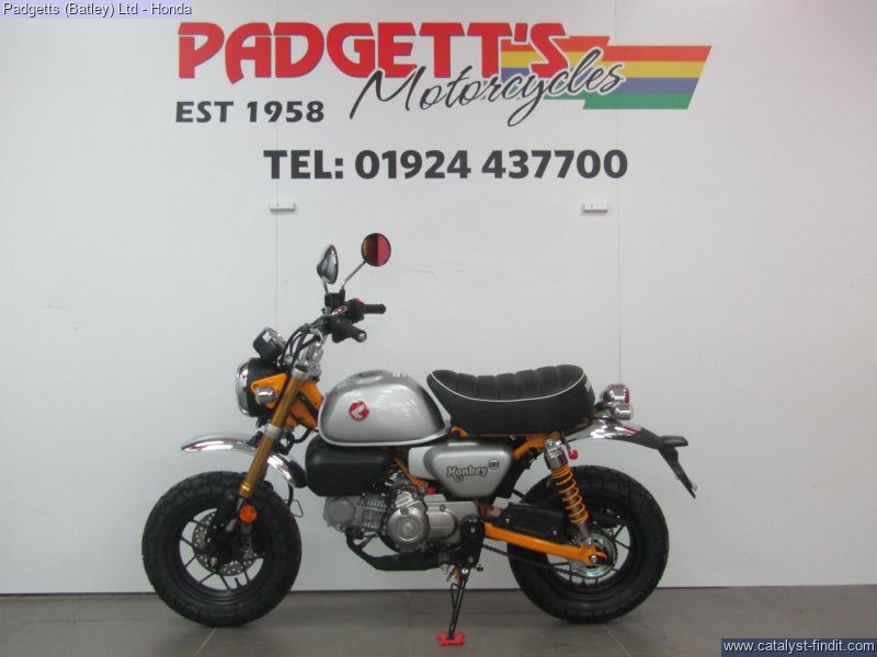 - We present here for sale this Honda 2025 Z125 Monkey. Release the pure fun of motorcycling. It’s what the Monkey’s made for. When you first see a Monkey with its unique style, it will make you smile. When you first ride a Monkey, you’re guaranteed to be wearing the biggest grin, especially with its characterful engine. Sure, it’s small enough to pack away behind a camper van, and wriggle through gaps in city traffic nothing else will get through. But what the Monkey is really all about is the sheer, basic joy of riding. And that’s the beauty of it. There’s nothing else quite like a Monkey. It has style all of its own. And character like nothing else. Chromed high-rise handlebars, plus frame, swingarm and shock absorbers painted the same colour as the peanut fuel tank – and the high-level mudguards – all draw attention, as do the chunky block-section tyres. But underneath it has a fuel-efficient air-cooled 125cc engine and 5-speed gearbox bolted into a sturdy chassis that features IMU-controlled ABS braking. It’s also small and light, just 104kg, with a comfy seat set just 775mm from the ground. A small bike with a big heart, built to put the fun in your function. That’s Monkey. The bike is available for viewing and is well worth a look. Finance is available and is subject to status. Part Exchanges welcome. Nationwide delivery can be arranged from as little as £75. Usual Dealer Facilities including a Large range of clothing, helmets & accessories. Call Padgett's Motorcycles today to ensure that you don't miss out; Suzuki Sales Centre 01924 609808, Honda Sales Centre 01924 437700 and Yamaha Sales Centre 01924 478491.