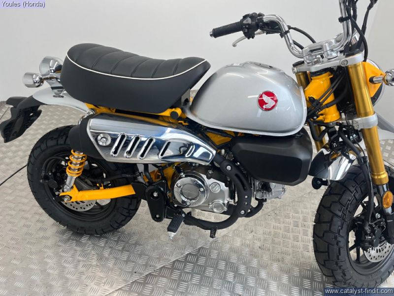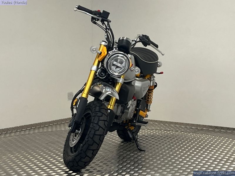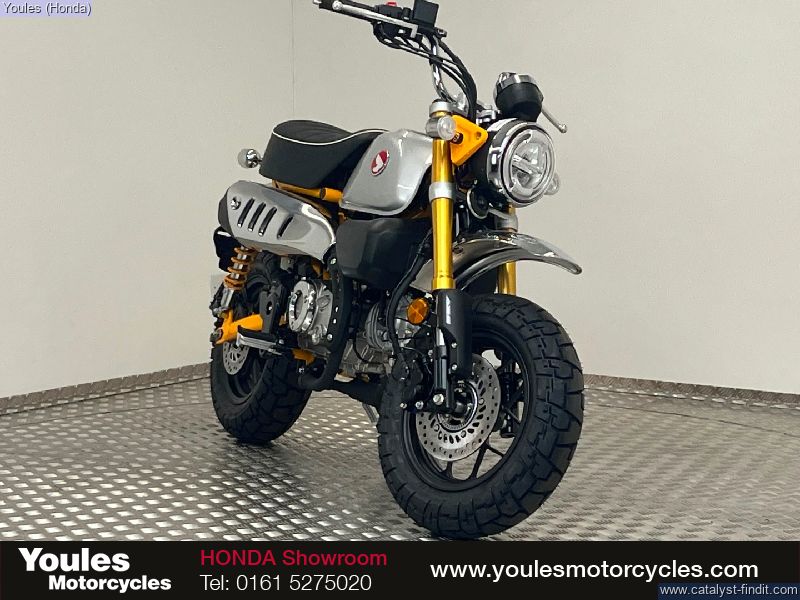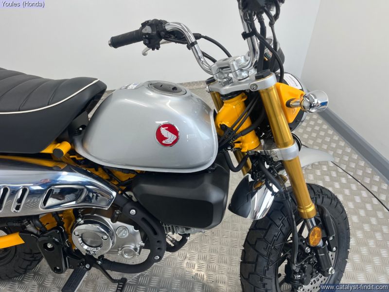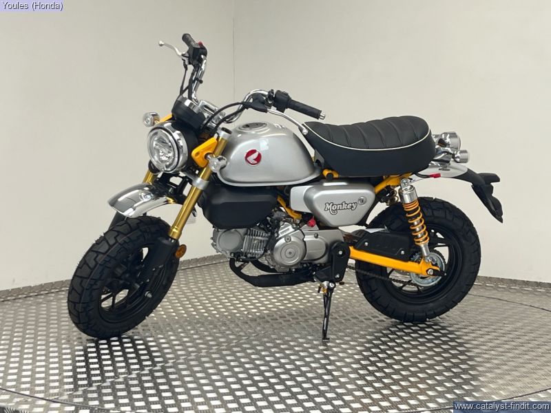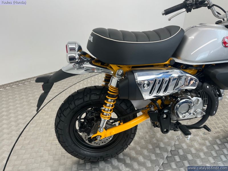 - There’s nothing else quite like a Monkey. It has style all of its own. And character like nothing else. Chromed high- rise handlebars, plus frame, swingarm and shock absorbers painted the same colour as the peanut fuel tank – and the high-level mudguards – all draw attention, as do the chunky block-section tyres. But underneath it has a brand-new, fuel-efficient air-cooled 125cc engine and 5-speed gearbox bolted into a sturdy chassis that features IMU-controlled ABS braking. It’s also small and light, just 104kg, with a comfy seat set just 775mm from the ground. A small bike with a big heart, built to put the fun in your function. That’s Monkey.