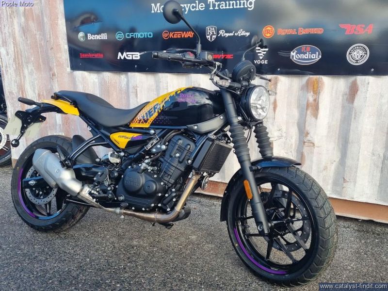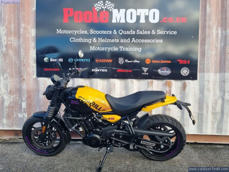 - The Royal Enfield Guerrilla 450 is a new, modern liquid- cooled roadster motorcycle designed for agility and everyday riding, sharing its engine and platform with the Himalayan 450 adventure bike. It is noted for its competitive price, accessible seat height, and engaging performance. Key Features and Specifications The Guerrilla 450 is positioned as an affordable and accessible A2-license-friendly bike that balances retro aesthetics with modern technology. Engine: It features Royal Enfield's first liquid-cooled engine, a 452cc single-cylinder 'Sherpa' unit with DOHC and four valves, producing 39.5 bhp (40 PS) at 8000 rpm and 40 Nm of torque at 5500 rpm. Chassis & Suspension: It uses a steel twin-downtube spine frame, with 43mm telescopic front forks and a linkage-type monoshock rear suspension by Showa. The handling is described as light and confidence-inspiring for city and twisty road use. Design & Ergonomics: The bike has an upright riding stance, a low 780mm seat height, and mid-set footpegs, making it approachable for a wide range of riders. It comes with 17- inch cast alloy wheels at both the front and rear with wide, tubeless tyres.