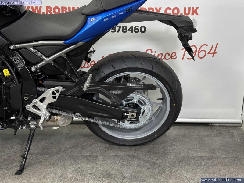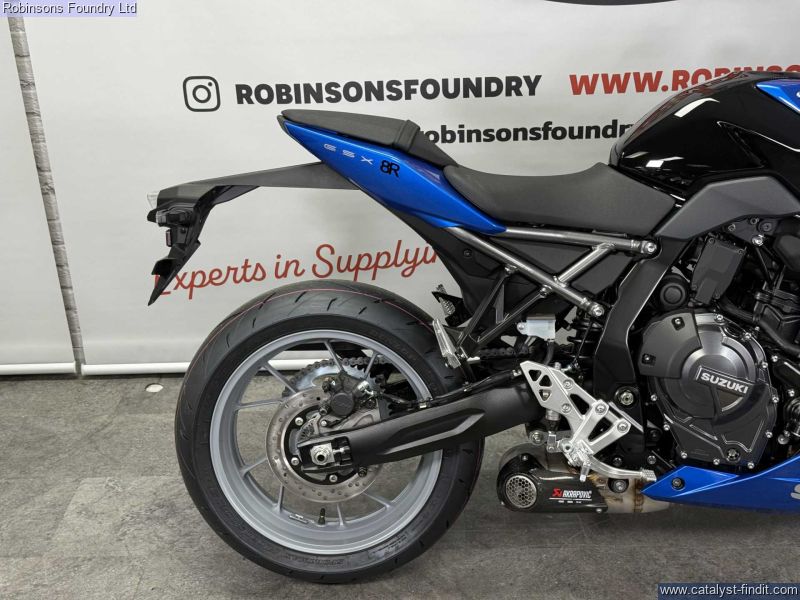 - The Suzuki GSX-8R is a contemporary middleweight sports motorcycle designed to deliver strong performance alongside real-world comfort and control. Built around Suzuki’s parallel-twin platform, the GSX-8R offers a balanced riding experience that combines sporty intent with approachability, making it suitable for both spirited riding and everyday use. Its full fairing design gives it an aggressive, modern look while also providing practical wind protection.The chassis and riding position are set up to inspire confidence, offering stable handling without sacrificing comfort. This makes the GSX-8R well suited to a wide range of riders, from those stepping up into the middleweight sports category to more experienced riders looking for a capable and versatile machine. The inclusion of a free Akrapovic exhaust adds extra appeal, enhancing the bike’s presence while complementing its performance-focused character.Overall, the Suzuki GSX-8R represents a strong blend of performance, style, and practicality. With the added benefit of a free Akrapovic exhaust, it delivers the look and feel of a true sports bike while remaining usable for daily riding, weekend trips, or longer journeys.Comes with 10 years manufacturers warranty and first years tax included. Walkaround videos and delivery options available upon request. Finance available from just £100 deposit (T&C's Apply).