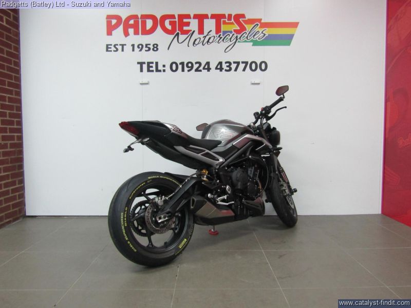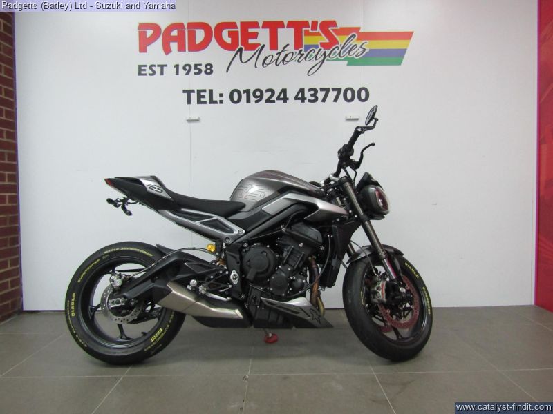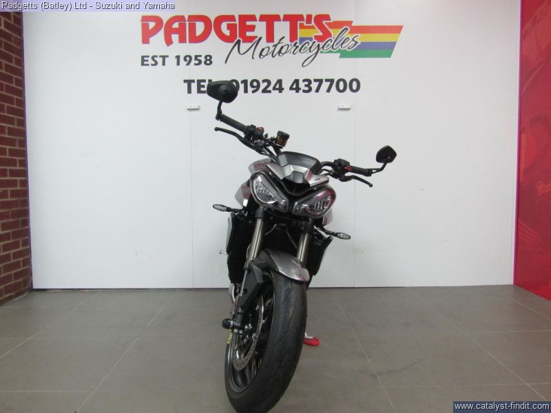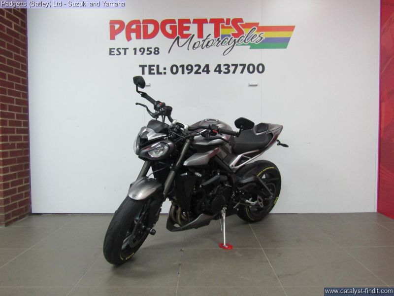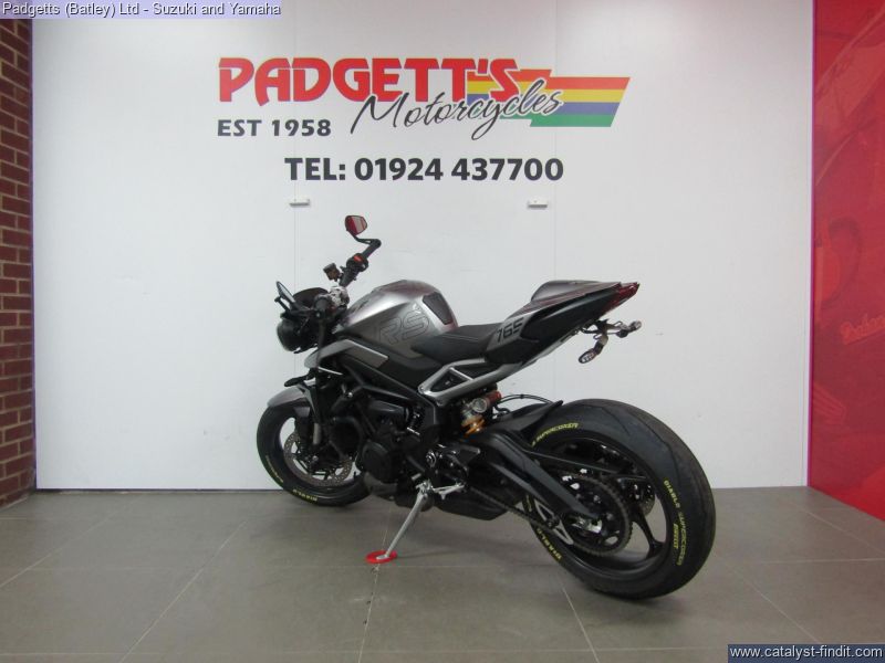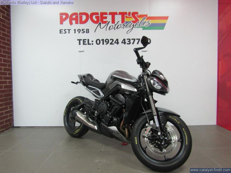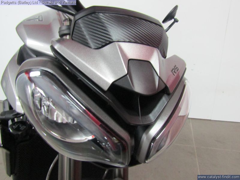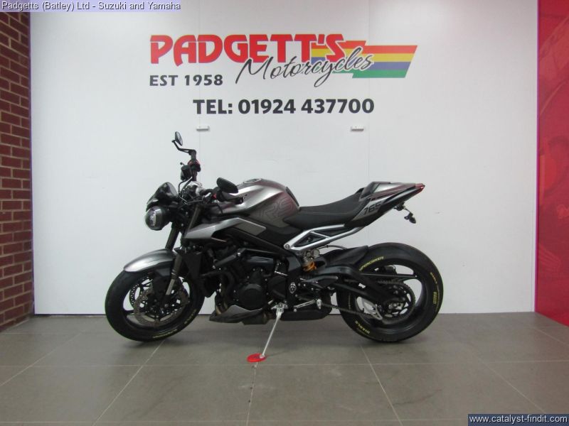 - We present here for sale this Triumph Street Triple RS 765 in Silver. The bike has only covered 2,780 miles and is in great condition. The bike has been fitted with some superb extras including: - Tail Tidy, Genuine Crash Protection, Genuine Triumph Seat Cowl and Bar End Mirrors. The bike comes complete with Original Owner’s Manual, 2 Keys, Service Book Showing Full Service History and Log book. The bike is available for viewing and is well worth a look. Finance is available and is subject to status. Part Exchanges welcome. Nationwide delivery can be arranged from as little as £75. Usual Dealer Facilities including a Large range of clothing, helmets & accessories. Call Padgett's Motorcycles today to ensure that you don't miss out; Suzuki Sales Centre 01924 609808, Honda Sales Centre 01924 437700 and Yamaha Sales Centre 01924 478491.