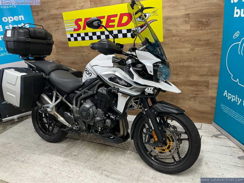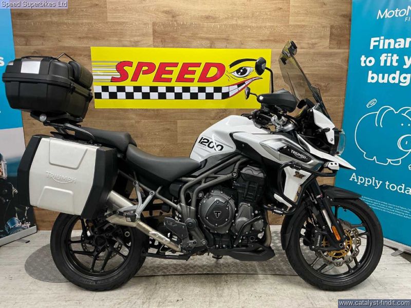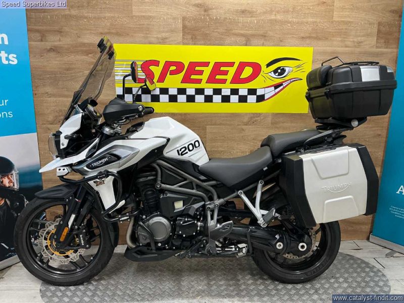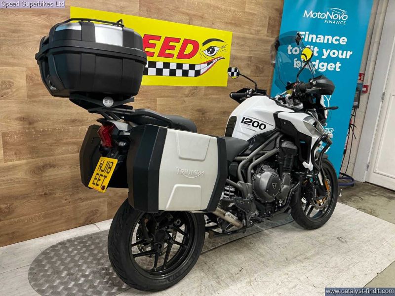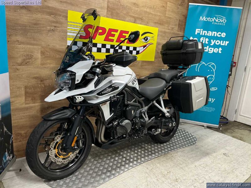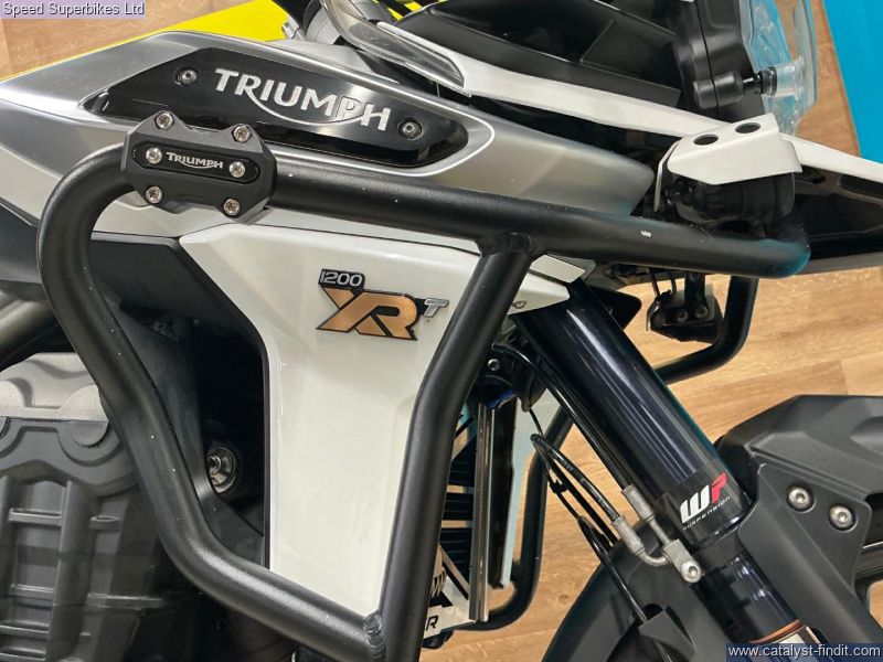 - 2018 Triumph Tiger 1200XRT, 40418 miles and 4 owners from new, hand and service books with 6 stamps, last service done at 39192 miles inc valve clearances plus spare key, MOT until 15/09/2026, the bike is in great condition and being a high spec XRT model it comes fitted with Triumph semi active suspention, heated seats, heated grips, cruise control, it also comes with panniers and top box, engine bars, Puig tall touring screen and headlight guard. The 2018 Triumph Tiger 1200 is the third generation version of Triumph’s big, shaft drive adventure bike first launched in 2012 as a direct rival to BMW’s R1200GS. There were three road (XR range) and three off-road models (XC range), much improved electronics and a host of engine (two extra bhp), comfort and chassis upgrades, the highlight being this semi active WP suspension, on the mid and high spec models. Retail bikes: Competitive finance & great part exchange allowances. Call our team for an easy, no obligation quote. All our retail bikes come with a full PDI, valet & 3 months total cover warranty (additional £75). Credit & debits cards accepted. Delivery in mainland UK from only £125 + VAT. Compulsory admin fee of £100 for 3rd party finance.