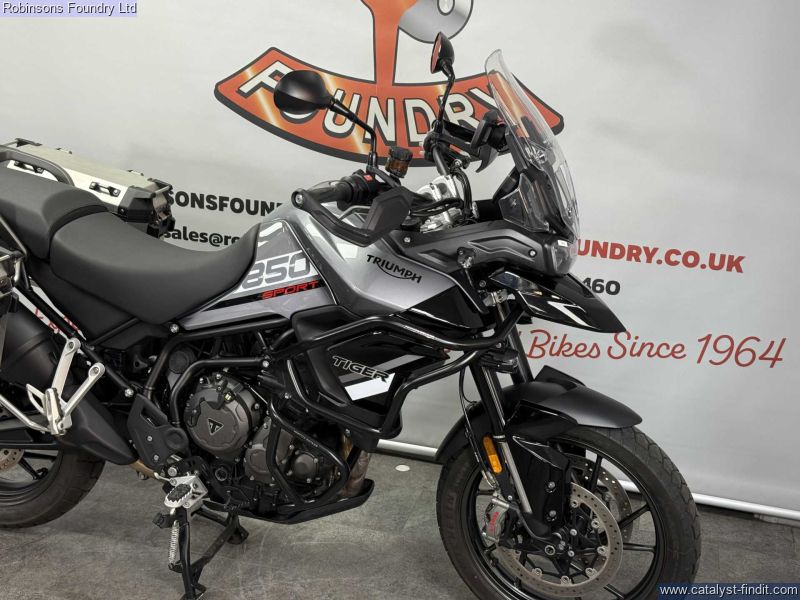 - Used Triumph Tiger 850 Sport for Sale – £8,750This beautifully presented Triumph Tiger 850 Sport comes fully equipped for adventure, with just 3,174 miles and a full Triumph service history, the last Triumph-approved service carried out in September. Finished in classic Triumph style and in excellent condition throughout, this bike has been fitted with a host of premium extras, including a TomTom Rider 550 sat nav, Hepco & Becker upper crash bars and lower protection, fog lights, and Triumph aluminium side panniers — all enhancing its capability and touring comfort.Powered by Triumph’s flexible 888cc triple engine, the Tiger 850 Sport delivers smooth, responsive performance on both road and trail, while offering the comfort and practicality that make it a true all-rounder.All vehicles are subject to a comprehensive pre-delivery inspection prior to collection and come with a minimum of 6 months MOT and 3 months/3000- mile warranty, with the option to extend (subject to T&Cs). HPI checked. Walkaround videos and delivery available upon request. Secure with a £100 deposit. Finance available (T&Cs apply).Our used stock changes constantly — please contact if you don’t see what you’re looking for.