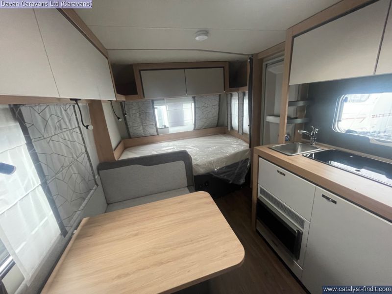 Its layout is tailored for families, offering fixed bunk beds for younger travellers and a spacious double bed for adults, ensuring comfort for all. The interior is thoughtfully arranged, with a functional kitchen that makes meal preparation straightforward and a seating area that converts easily for additional sleeping space.
