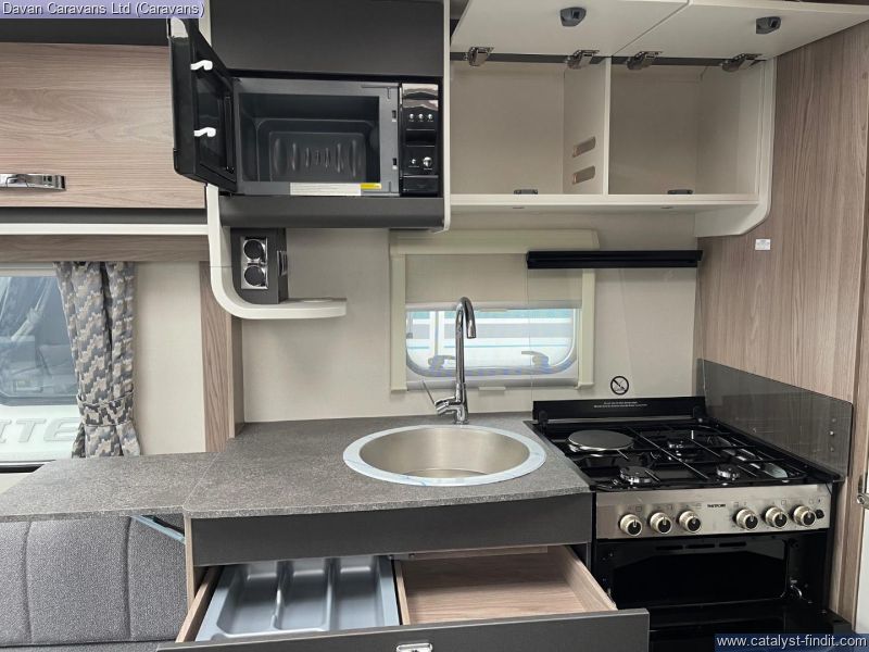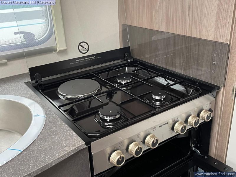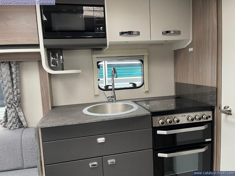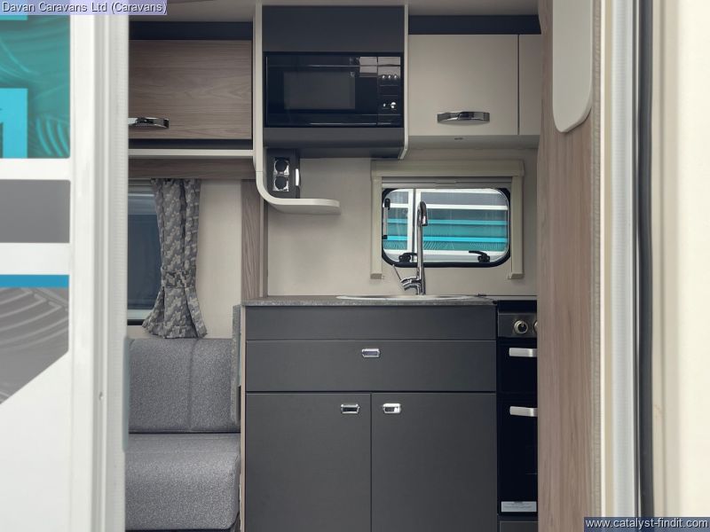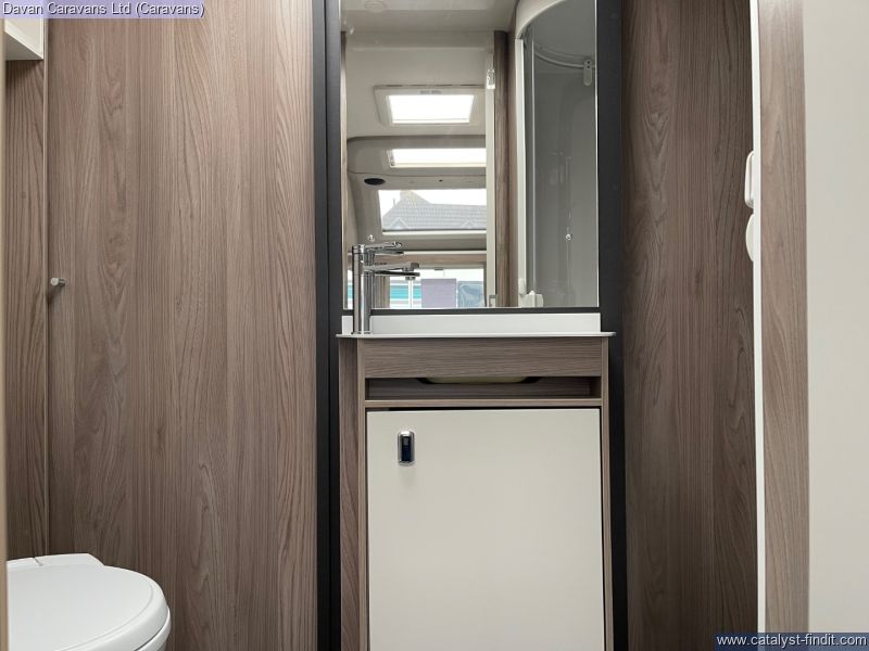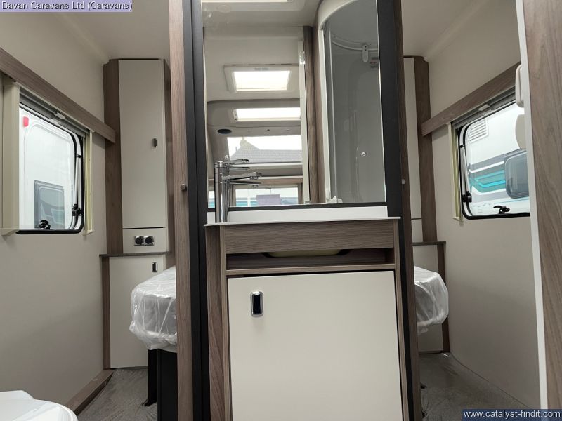 At the rear, the fixed end bunk configuration offers two cosy single beds, perfect for children or guests, with an easy-access ladder and safety rail ensuring comfort and peace of mind. Between living and sleeping zones, the central kitchen features a three-burner Spinflo hob, stainless-steel sink and a 139-litre Dometic fridge, all wrapped in wipe-clean cabinetry that makes meal preparation a pleasure. Opposite, the full-width washroom houses a separate shower cubicle, Thetford cassette toilet and vanity area, delivering genuine four-season convenience no matter where the road takes you.
