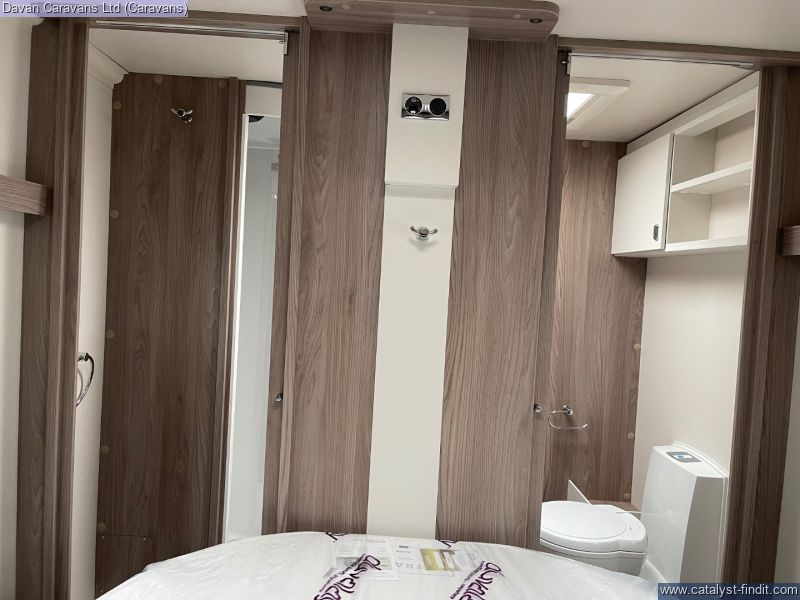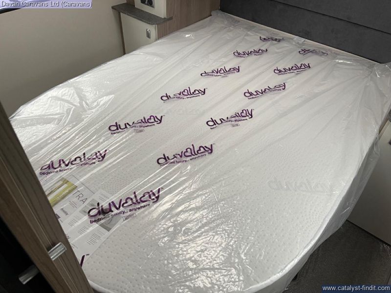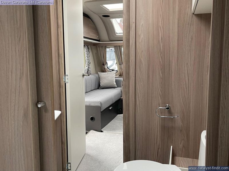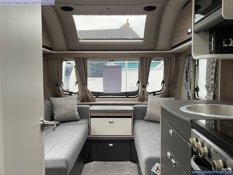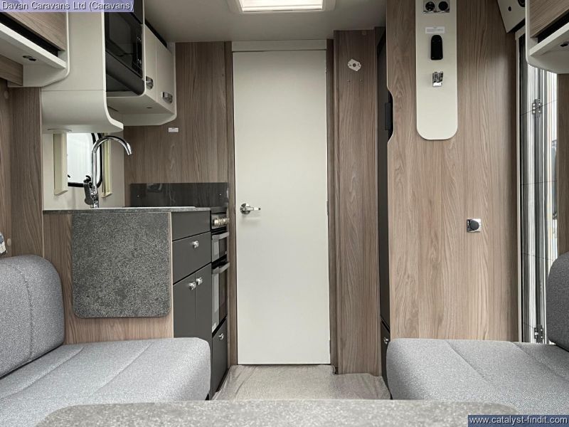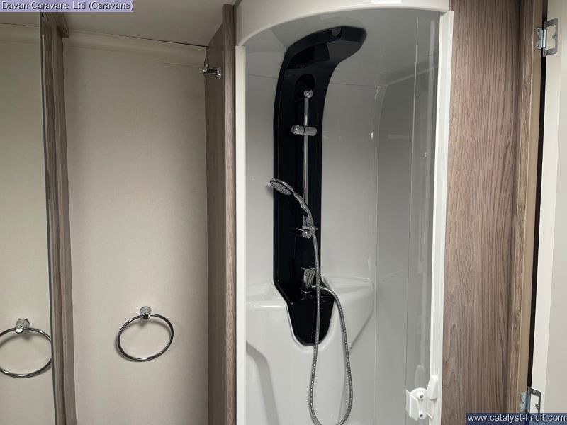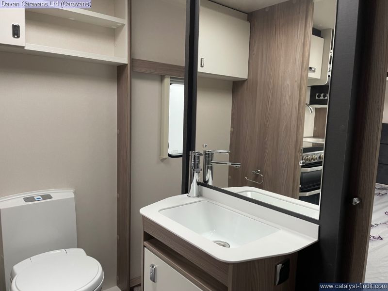 At the rear, the fixed end bunk configuration offers two cosy single beds, perfect for children or guests, with an easy-access ladder and safety rail ensuring comfort and peace of mind. Between living and sleeping zones, the central kitchen features a three-burner Spinflo hob, stainless-steel sink and a 139-litre Dometic fridge, all wrapped in wipe-clean cabinetry that makes meal preparation a pleasure. Opposite, the full-width washroom houses a separate shower cubicle, Thetford cassette toilet and vanity area, delivering genuine four-season convenience no matter where the road takes you.