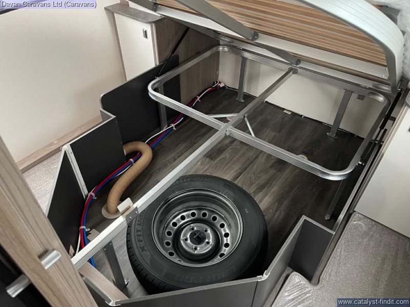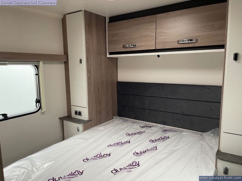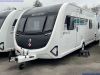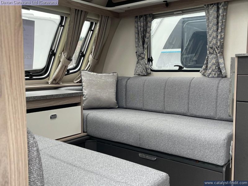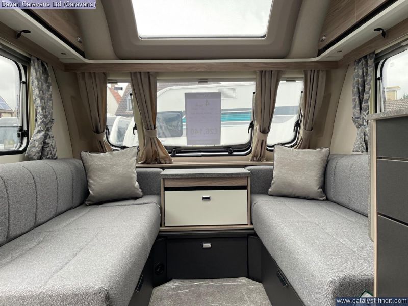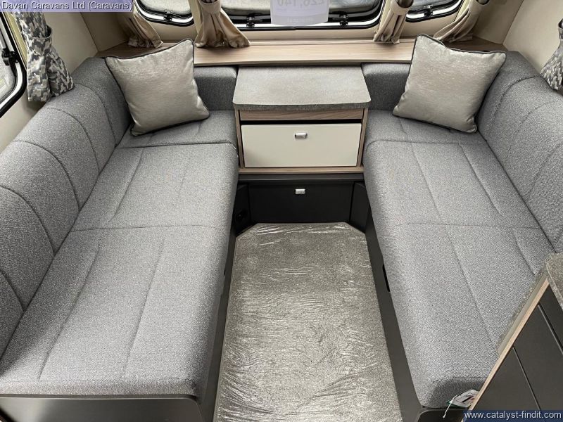 The 2025 Sprite Major 4 EB for sale with a rear island bed. a family-focused touring caravan that blends sleek modern stylingwith intelligent end-bunk layout. From its aerodynamic exterior finished in bold Sprite graphics to the expansive panoramic front window, this caravan turns every campsite into a chic retreat. Step inside to find a light- filled front lounge where deep-seated benches and ambient LED lighting set the scene for relaxing mornings or starlit evenings, while clever under-seat storage keeps your kit neatly organised.