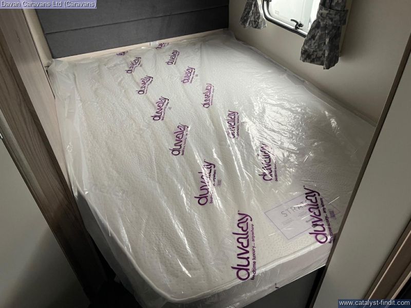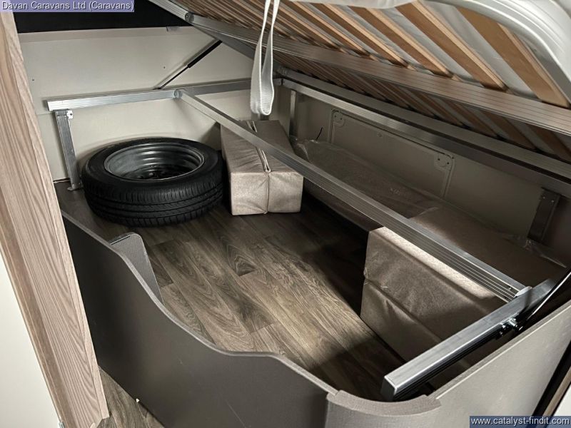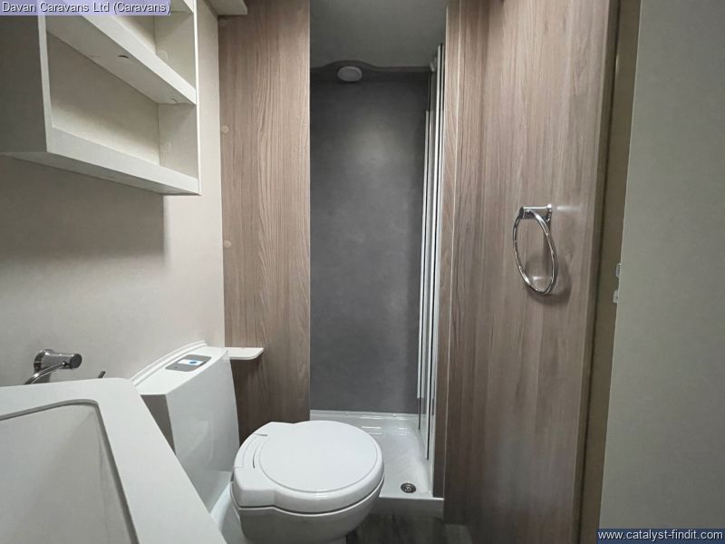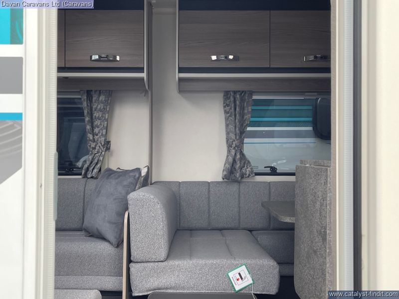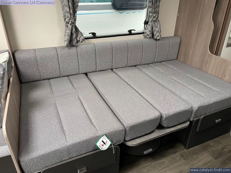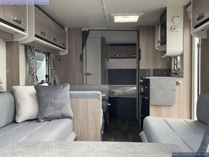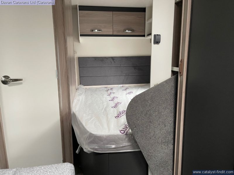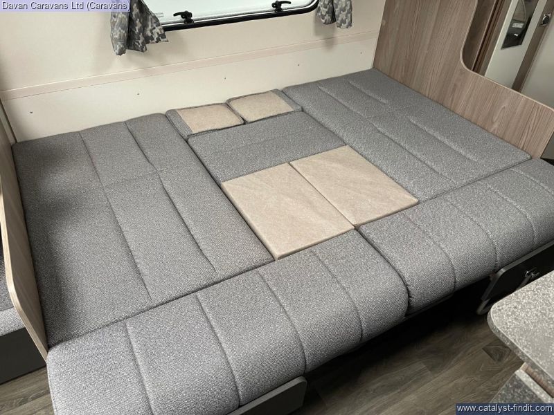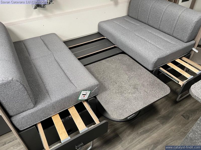 The front lounge converts seamlessly into a comfortable double bed, and at the rear the fixed French bed features a supportive memory- foam mattress and ambient LED surround lighting. Premium soft- touch fabrics, European-style cabinetry and subtle mood lighting combine to deliver a refined residential feel, ensuring every journey feels like a boutique retreat on wheels. was £31,940 This caravan includes: