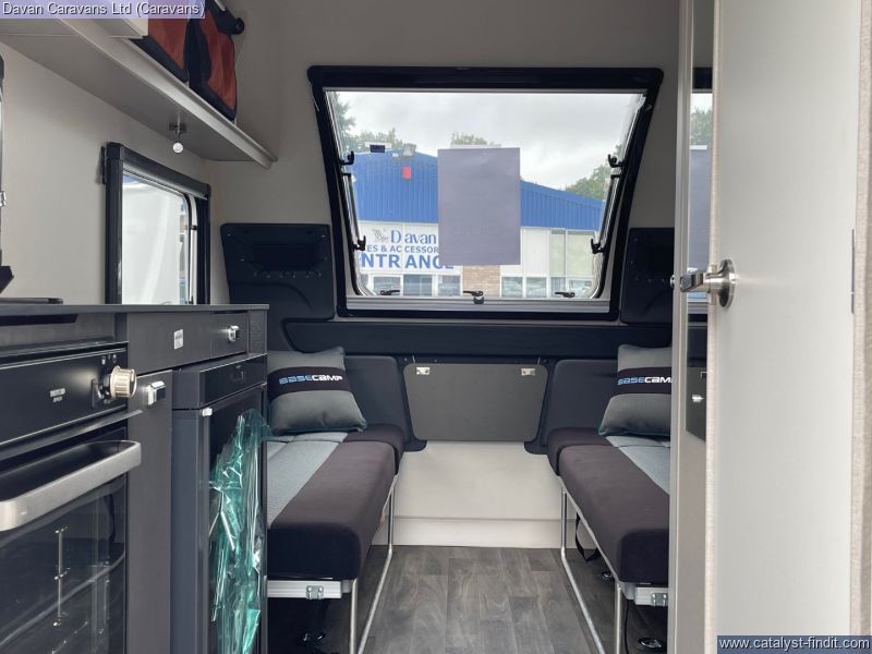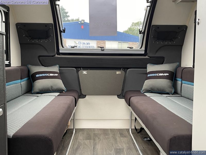 - The Swift Basecamp 2 is the perfect lightweight adventure caravan from one of the UK's top manufacturers. It features a slimline solar panel, diamond cut alloy wheels, and a touchscreen command control panel, making it an impressive choice. At only 5.1M long, the Basecamp 2 is compact and simple to tow. The open interior and big front window give couples plenty of space to relax, while the galley kitchen allows for a variety of camping cooking with an oven, grill, and hob included. The folding benches can store a variety of outdoor items, ranging from kayaks to surfboards, bicycles to skis - making it the ideal caravan for any excursion.