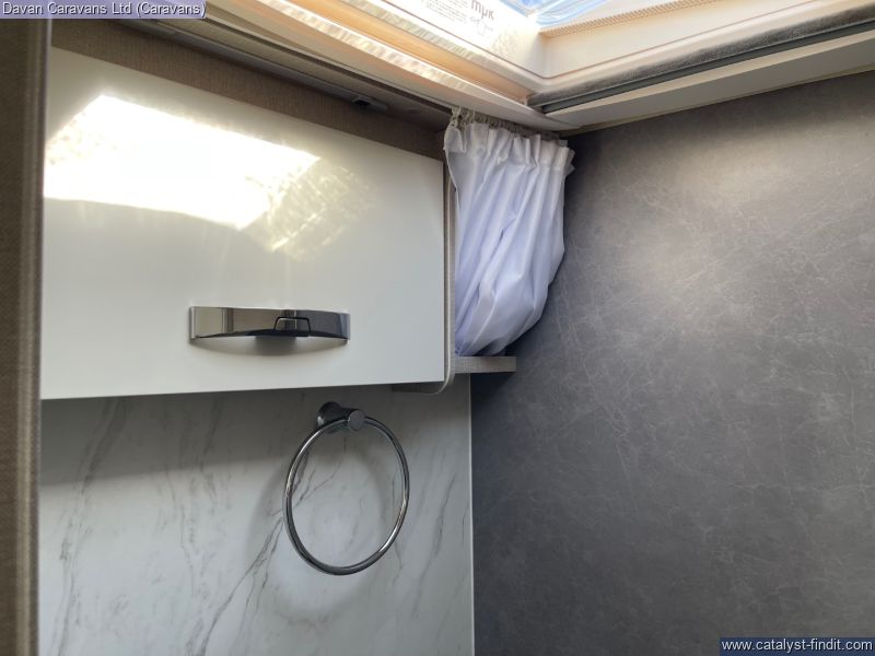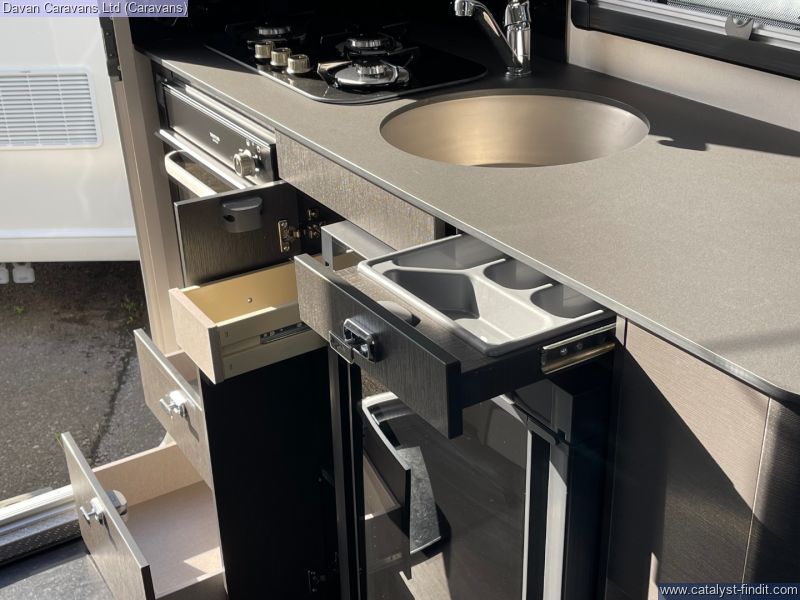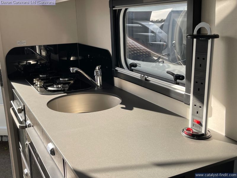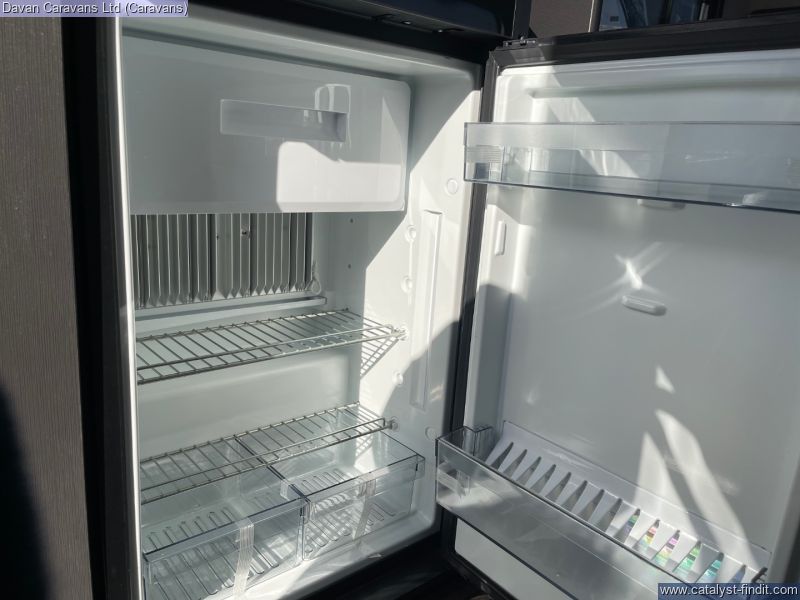Opposite, a compact kitchen boasts a two-burner hob, deep stainless- steel sink and a 65-litre compressor fridge, all framed by easy-clean surfaces that handle camp-cooking spills with ease. When nature calls, the swift-access wet room delivers a practical shower, cassette toilet and vanity area, so you stay fresh no matter how remote your campsite. was £25,720 this caravan includes