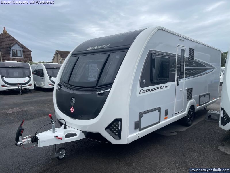 - 2026 Swift Conqueor 580 - A luxurious 4 berth model with a large island bed, spacious rear washroom, alde heating, tall fridge and New striking graphics. Returning by popular demand, the conqueror range is a well loved favourite amongstcaravanners. Cleverly designed with comfort in mind it offers a refined space that feels just like home from wider double beds complete with luxurious duvalay mattresses to the warmth of alde heating. With generous kitchen space, clever storage and soft atmospheric lighting throughout. The conqueror range blends practicality with sophistication creating the perfect setting for relaxing gataways.
