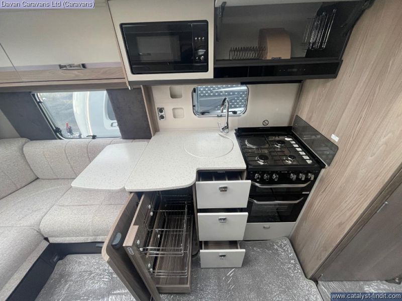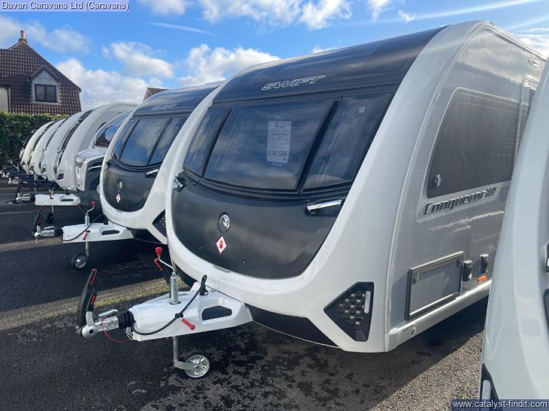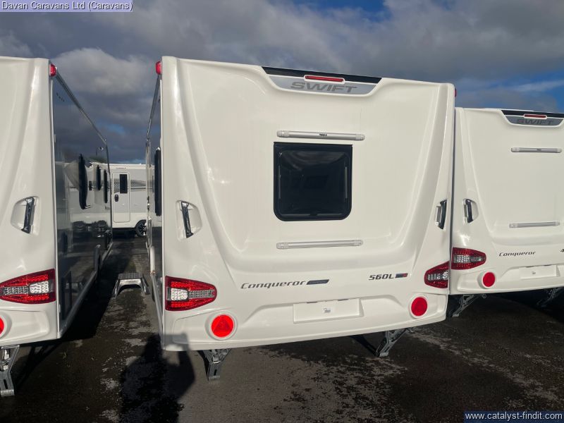 - 2026 Swift Conqueor Grande 560L - A luxurious 8ft wide, single axle caravan with a large rear island bed, alde heating, tall fridge and New striking graphics. Returning by popular demand, the conqueror range is a well loved favourite amongst caravanners. Cleverly designed with comfort in mind it offers a refined space that feels just like home from wider double beds complete with luxurious duvalay mattresses to the warmth of alde heating. With generous kitchen space, clever storage and soft atmospheric lighting throughout. The conqueror range blends practicality with sophistication creating the perfect setting for relaxing gataways.