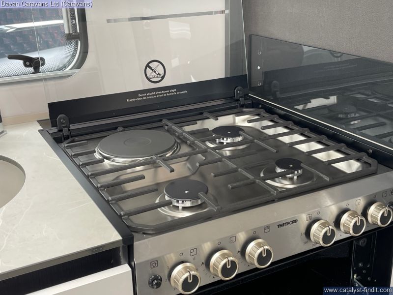 Step inside to discover a thoughtfully designed interior where space meets sophistication. The front lounge, framed by panoramic windows, offers a welcoming retreat bathed in natural light by day and transforms into a sumptuous double bed by night. At the heart of the living area, a fixed island bed provides hotel-style luxury with easy access from either side, while dual bedside cabinets and a full-height wardrobe keep your essentials neatly stowed.