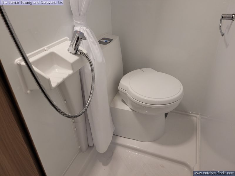 - To the right on one side you have a Double French Bed with the corner cut of for access purposes, beside the bed is a bathrooom sink outside of the Shower room & toilet, this is as a wet room set up would be, with a shower curtain thart draws around whilst using the shower itself