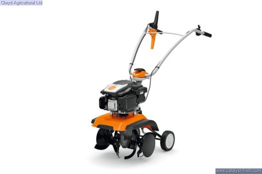 - THE MANOEUVRABLE STIHL TILLER MH 445 R WAS DEVELOPED FOR TILLING SMALL AND MEDIUM-SIZED PLOTS OF LAND AND WHEN WORKING IN CONFINED AREAS. IN ADDITION TO A COMPACT DESIGN AND BALANCED CENTRE OF GRAVITY, THE REVERSE GEAR MAKES IT EASIER FOR YOU TO MANOEUVRE AND CHANGE YOUR DIRECTION OF TRAVEL. THE POWERFUL STIHL EVC PETROL ENGINE MAKES TILLING THE SOIL AN EFFORTLESS TASK. THE MH 445 R IS FITTED WITH BLADES SPECIALLY DESIGNED TO BREAK UP AND MIX THE GROUND WITH MAXIMUM EFFICIENCY. THE BLADES CUT RAPIDLY INTO THE EARTH AND ARE SPREAD ACROSS A STANDARD WIDTH OF 45 CM, WHICH CAN BE ADJUSTED IF REQUIRED. THE HEIGHT OF THE BRAKE SPUR CAN BE ADJUSTED TO ONE OF THREE SETTINGS TO ENSURE THE TILLER HOLDS A STRAIGHT LINE. AN INTEGRAL ANTI-VIBRATION SYSTEM EFFECTIVELY REDUCES THE VIBRATIONS FROM THE ENGINE AND RELIEVES SOME OF THE PHYSICAL STRESS YOU MAY FEEL WHEN GARDENING. THE ERGONOMIC HANDLEBAR CAN BE INDIVIDUALLY ADJUSTED TO YOUR RESPECTIVE BODY HEIGHT. YOU CAN ACTUATE THE CHASSIS ON THE TILLER USING YOUR HAND OR FOOT AND ACCELERATE USING YOUR THUMB. PRIOR TO PERFORMING CLEANING OR ASSEMBLY WORK, THE STIHL MH 445 R CAN BE TIPPED ONTO ITS TRANSPORT WHEELS TO GIVE EASIER ACCESS TO THE BLADES.