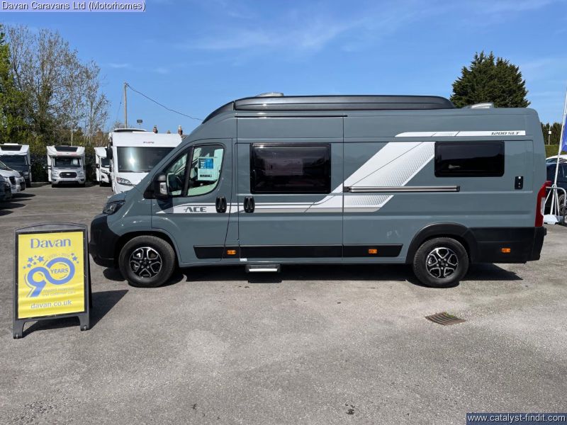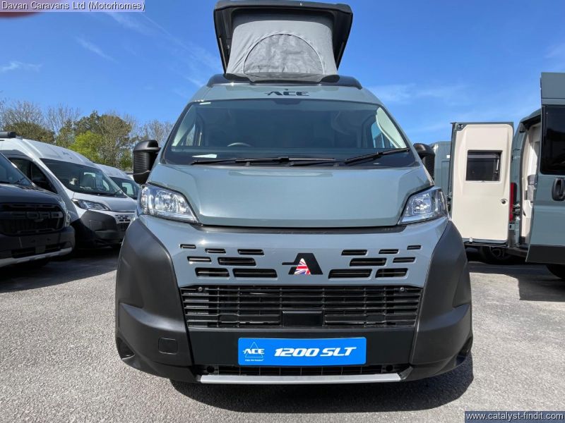- The Ace 1200 SLT is a practical, Spacious Fiat based panel van with lots of living space, Storage and comfort. The 1200 SLT features a spacious pop top capable of sleeping two adults, upolstered swivel seats, 2 Burner hob, Built in microwave, 80l fridge and fold away table extension, Whale blown air heating system, practical washroom with fold away sink, casette toilet and ecocamel jetstorm shower head, 91L Fresh water tank and 58l waste water tank. Davan have ordered this vehcile with the drivers pack and as an automatic (140bhp 2.2l) Please call our sales team on 01934 524 242 to discuss this model.