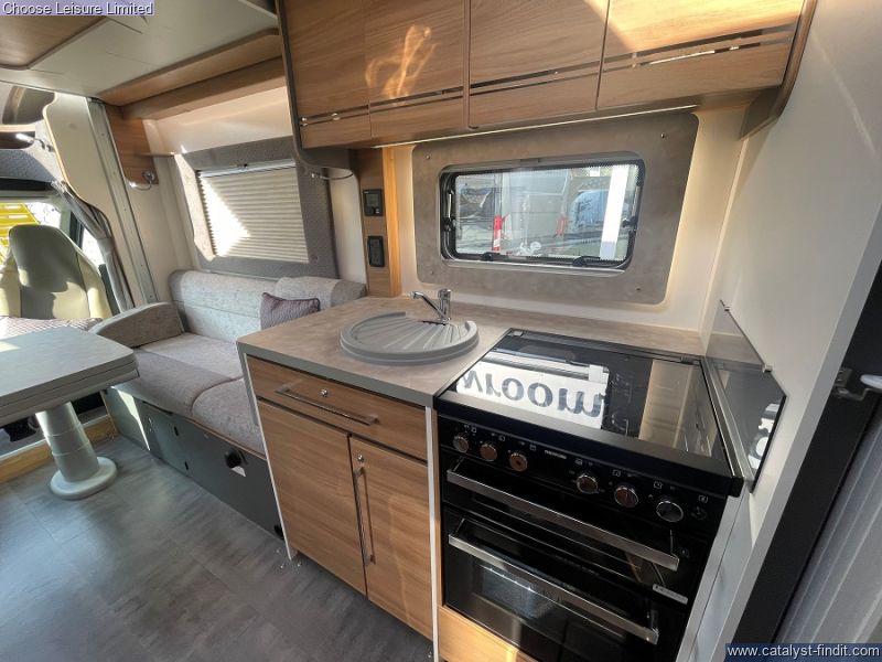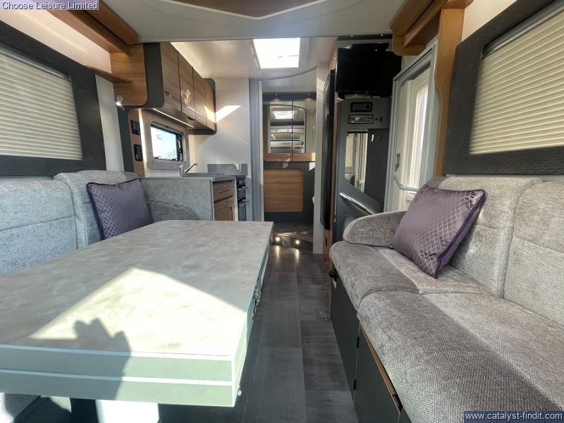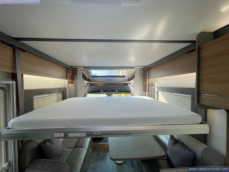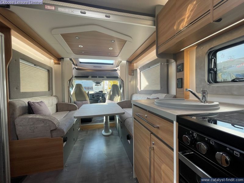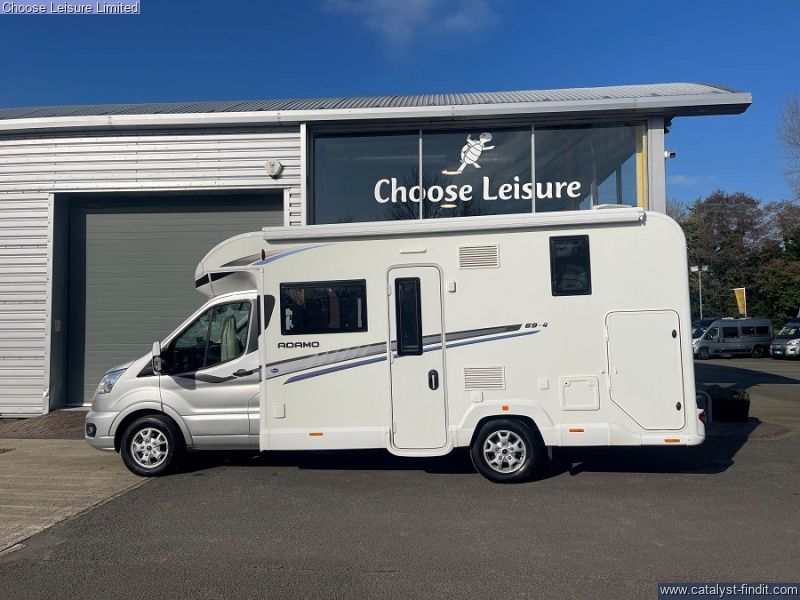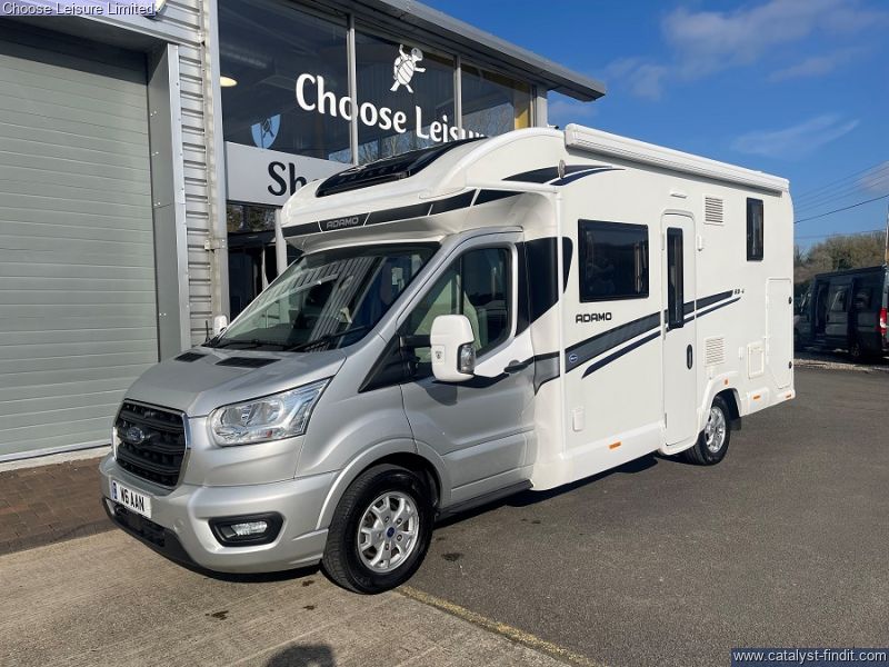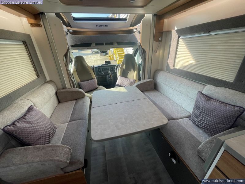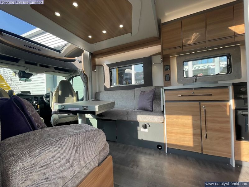 - This Adamo's flexible layout starts in the front lounge that includes two additional travel seats and an adjustable table for dining or leisure activities. Bright and airy thanks to the large windows on either side. The mid kitchen has been designed to fit a lot into a small space - whip up meals when your away hassle free. Above the lounge area is an electric drop down bed that makes retiring for the night effortless, when further sleeping space is required, the lounge underneath converts into a second double bed. The bathroom is neat and modern with a separate shower cubicle. An exterior garage allows you to keep tidy inside by housing all the larger, bulky items away. With very low mileage, we think you'll love this sophisticated model! Technical:
