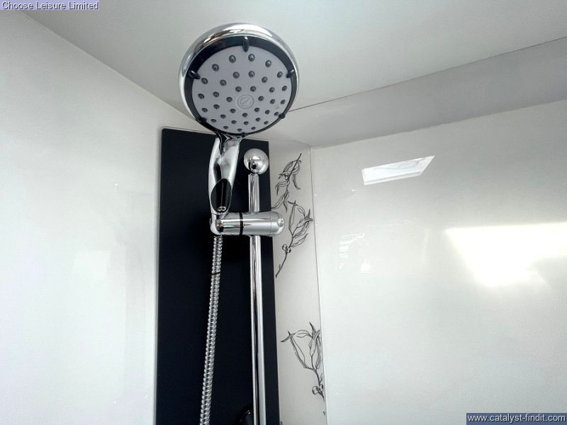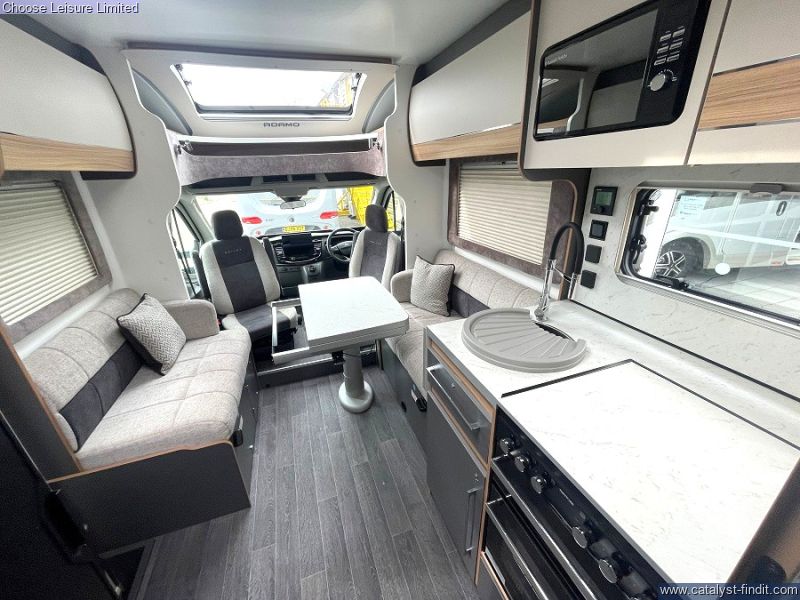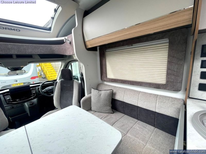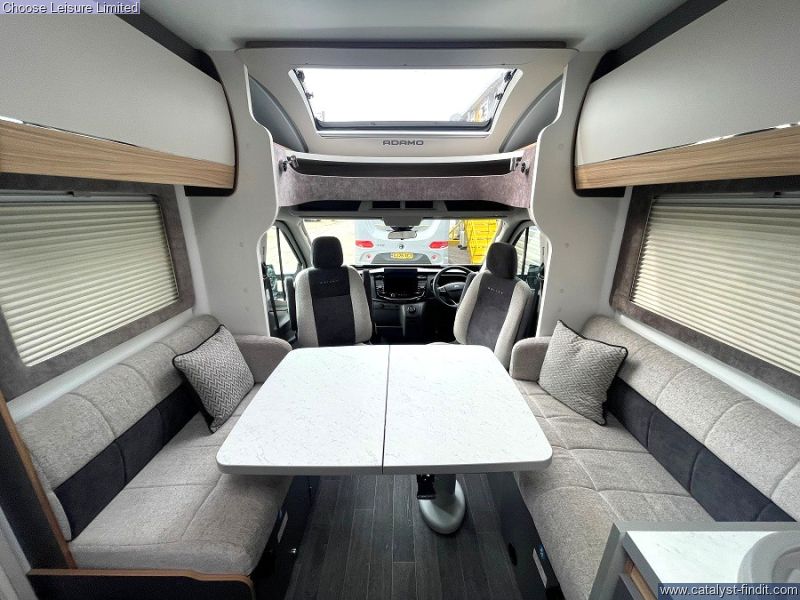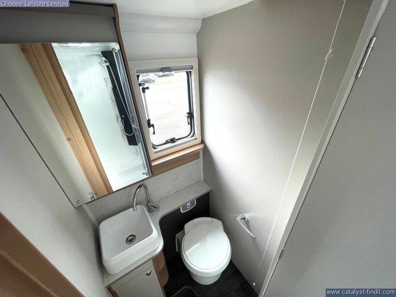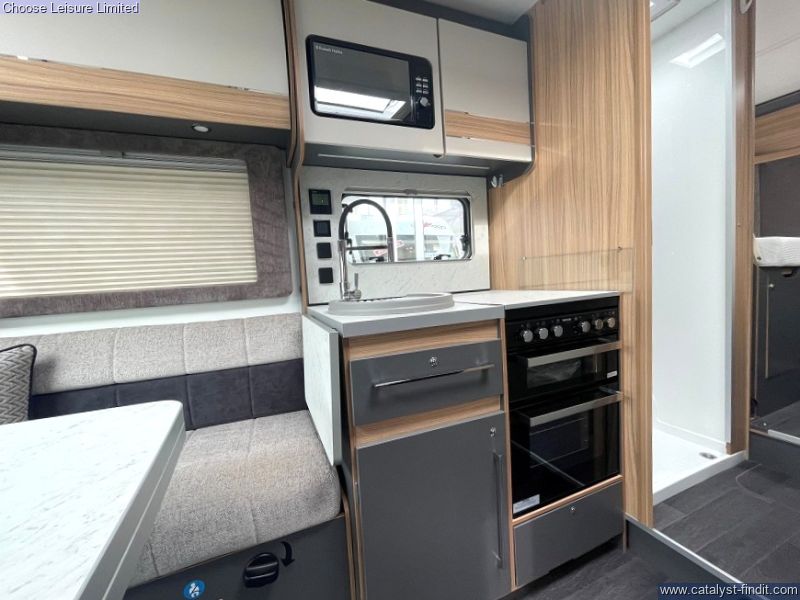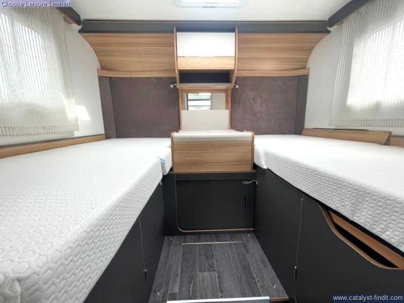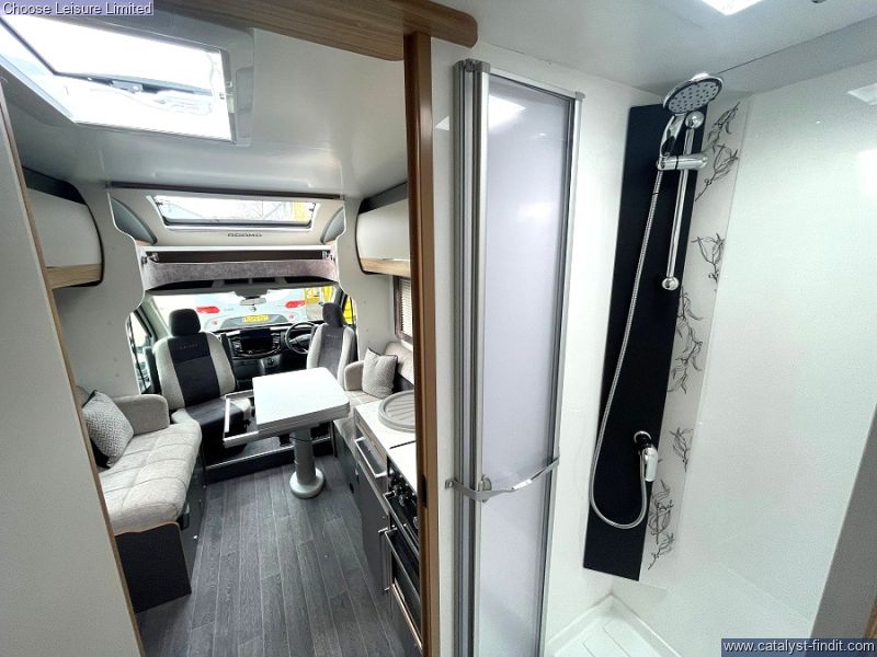 - Built on a Ford Transit with a 2.0L,165bhp engine and 8- speed automatic gearbox. Enter the living accommodation through the habitation door to find a Flexi lounge with convertible Aguti travel seats, ISOFIX, and electric pedestal table. The Aguti travel seats mean you have a comfortable sofa to sit on when pitched up, with foldaway travel seats including built-in seatbelts, headrest and ISOFIX points when on the road. Following on from this you'll find a Fully equipped kitchen with a Thetford 150L compressor tower fridge. Towards the rear of the motorhome is a walkthrough central washroom with separate shower and then raised rear twin single beds with under-bed and under-floor storage. Extra storage is provided via a Large rear garage with double doors, with a heating outlet and 230V power supply included. You'll be ready whatever the weather with the Alu-Tech insulation and Truma Combi 6E heating.