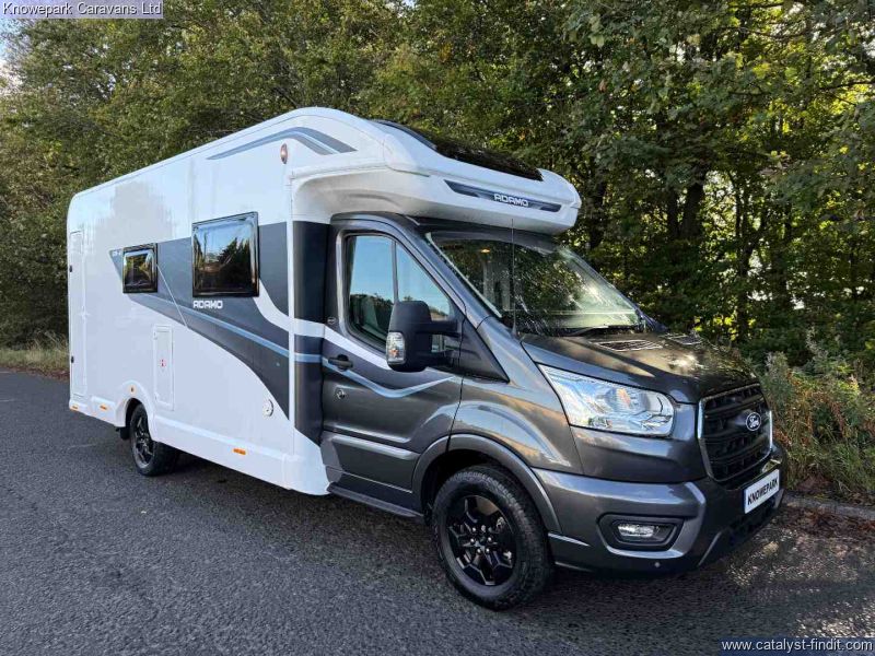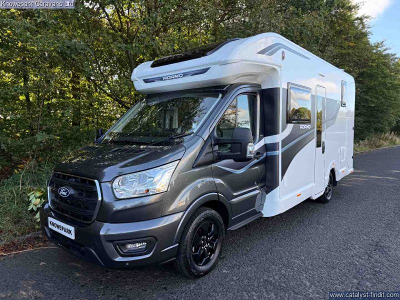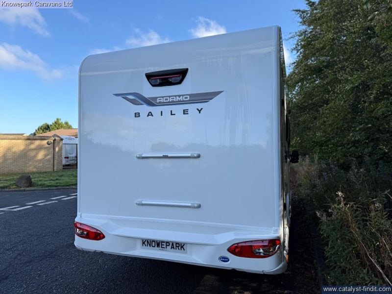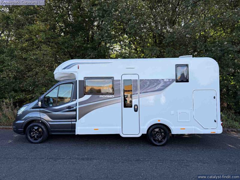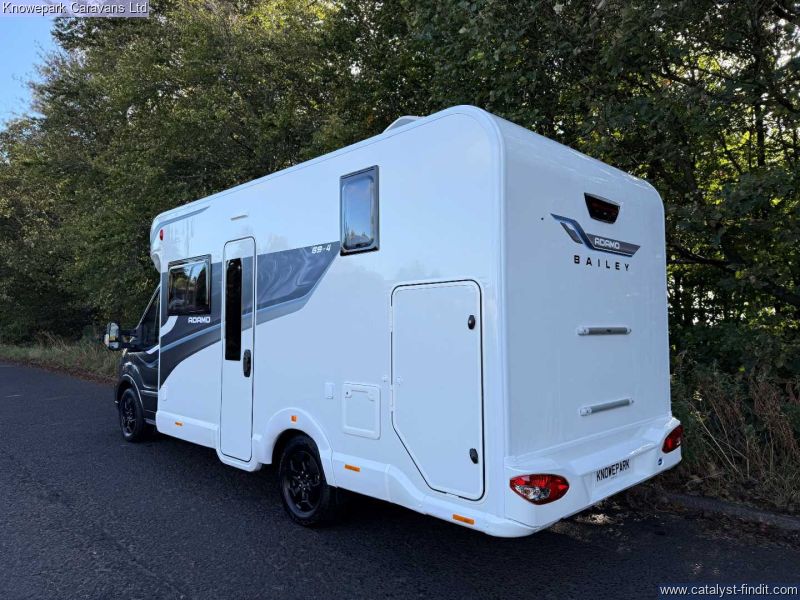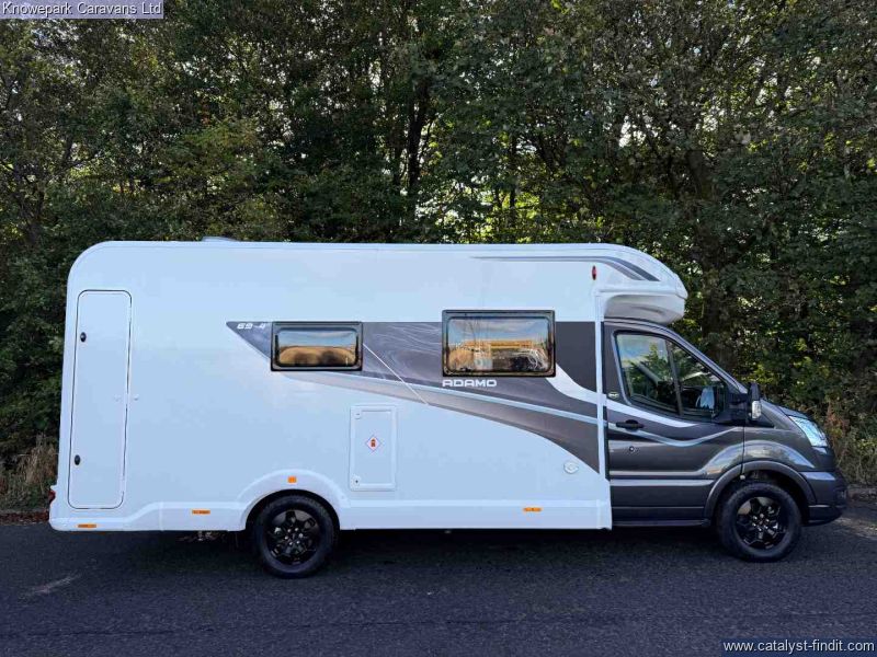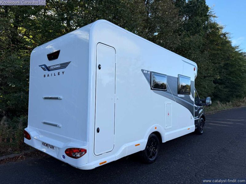 - The 2025 Bailey Adamo 69-4 is a versatile 4-berth motorhome that combines contemporary design with practical features, making it ideal for couples and families seeking comfort and flexibility on the road.Key Features:Sleeping & Seating: Accommodates up to four people with an electrically operated drop-down king-sized bed above the front lounge and a convertible seating area. Equipped with four seatbelts, including twin Aguti convertible travel seats with ISOFIX. Interior Amenities: Features a fully equipped kitchen with a Thetford 150L compressor tower fridge, combined oven, grill, and dual-fuel hob. The spacious rear washroom includes a separate shower, countertop washbasin, and ample storage. Technology & Comfort: Built on a Ford Transit chassis with a 2.0L 165bhp engine and 8-speed automatic gearbox, it offers a smooth driving experience. The in-vehicle infotainment system includes a 12” touchscreen with DAB radio, Apple CarPlay™/Android Auto™, satellite navigation, Bluetooth, and USB connectivity. Additional features include Truma Combi 6E heating, a 200W solar panel, and a 105 Ah AGM leisure battery.Storage & Dimensions: The motorhome boasts a large rear garage with double doors, heating outlet, and 230V power supply, providing ample storage for equipment. Measuring 6.986 meters in length and with a maximum laden weight of 3,500kg, it is suitable for standard driving licenses.With its combination of modern technology, practical design, and stylish aesthetics, the Bailey Adamo 69-4 is ready to take you on your next adventure. Finance Available.