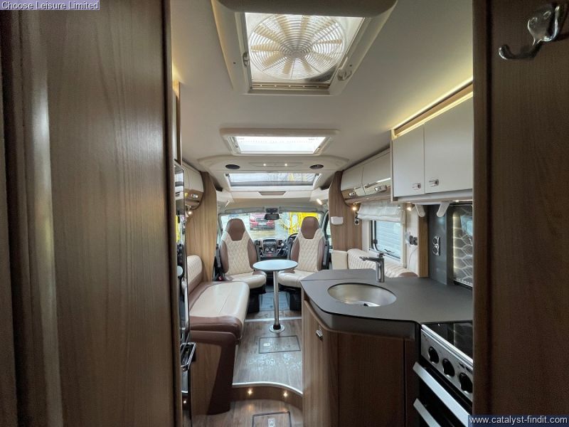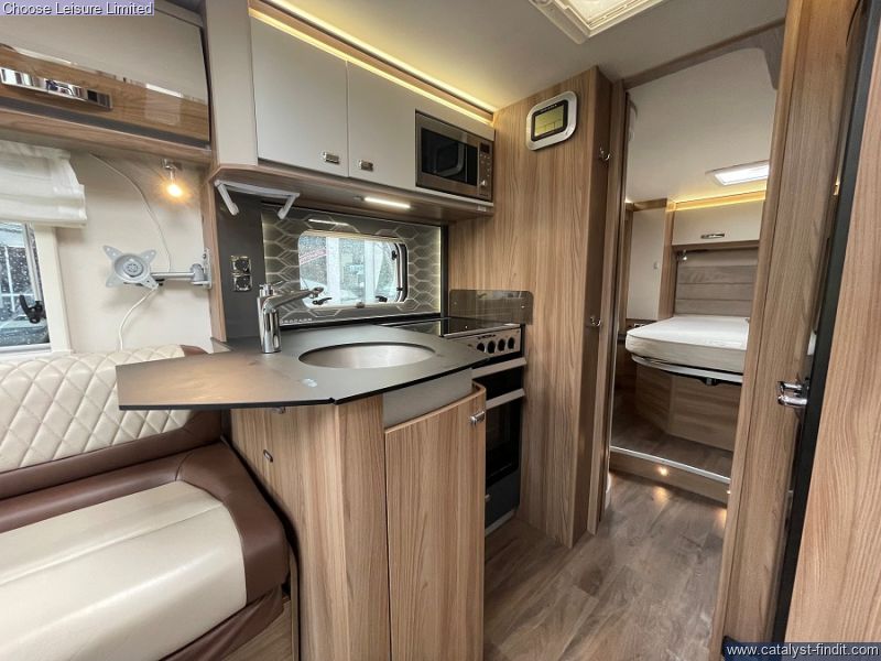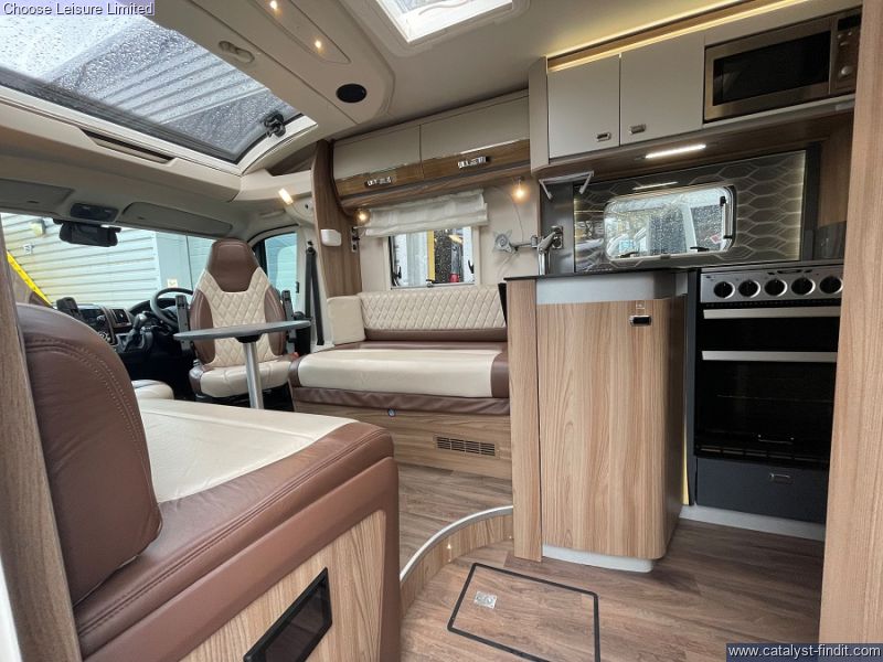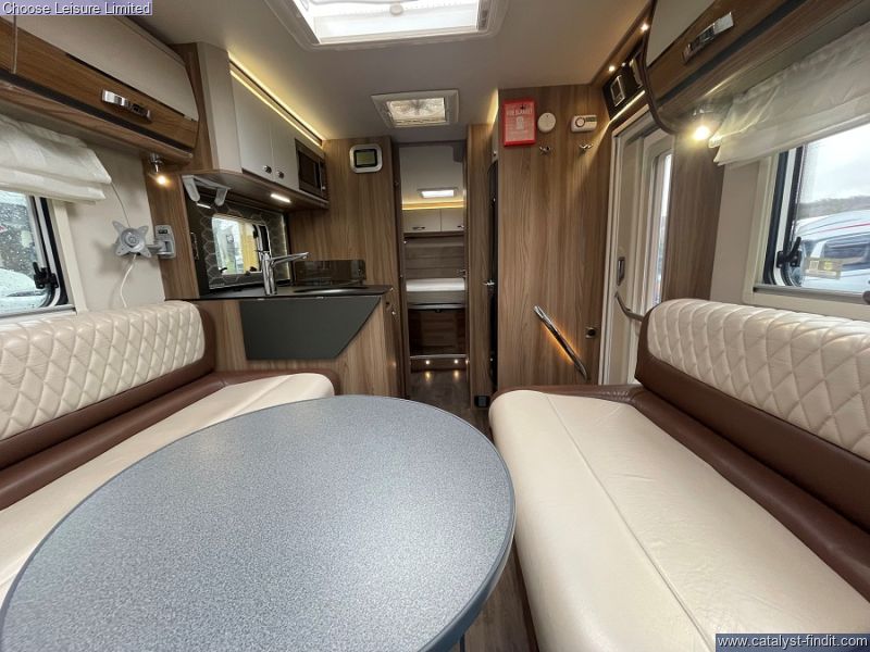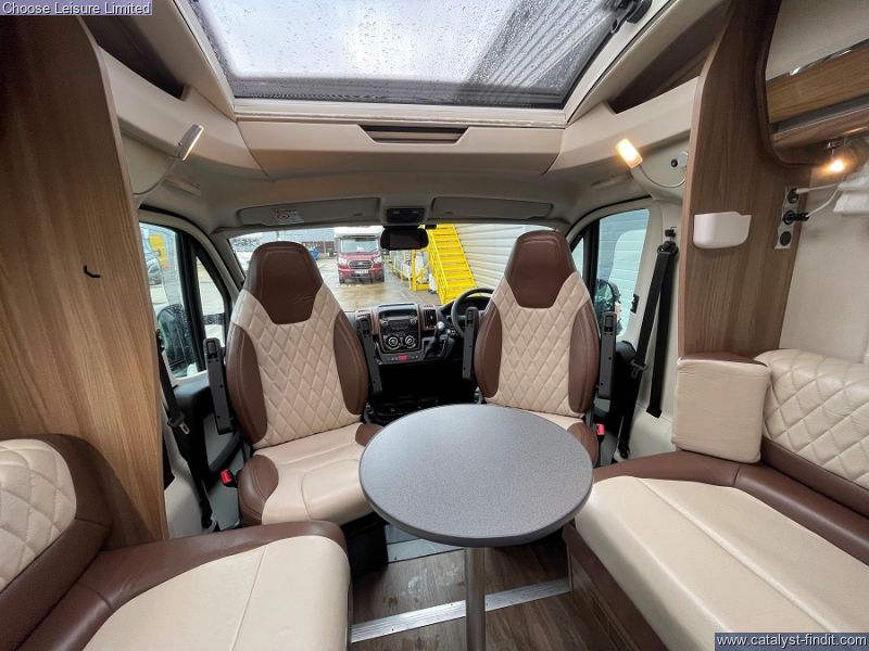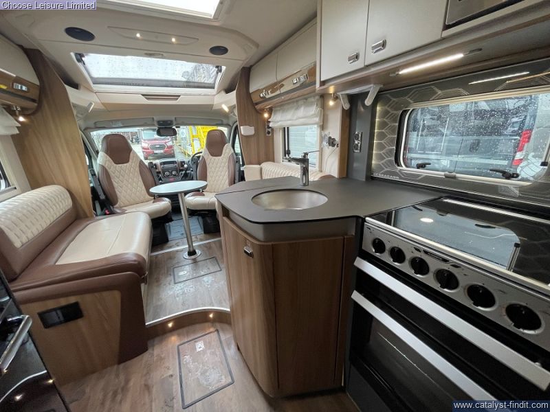 - Starting at the front, you'll find a spacious lounge area that seats 6 comfortably once the seats have been swiveled. A small dining table can be added and removed as required. From the lounge space is a neat mid kitchen providing all of the essentials required for a self sufficient getaway. We then move onto the luxurious bedroom/bathroom area that covers the rear end of the motorhome. A palatial island bed sits between two wardrobes and provides a sanctuary that can be closed off in the evening for comfort rest. To one side of the motorhome you have a shower cubicle and facing that is your washroom that sits as an ensuite once the rear is closed off. Smart, practical and family orientated, all set for further adventures! Technical: