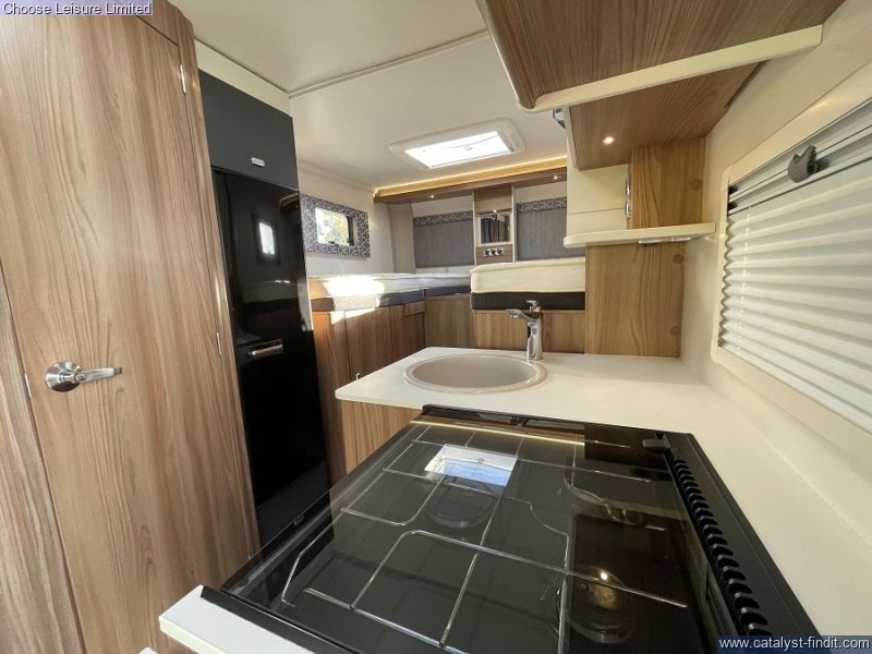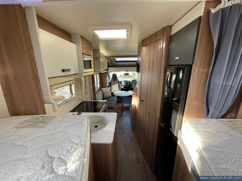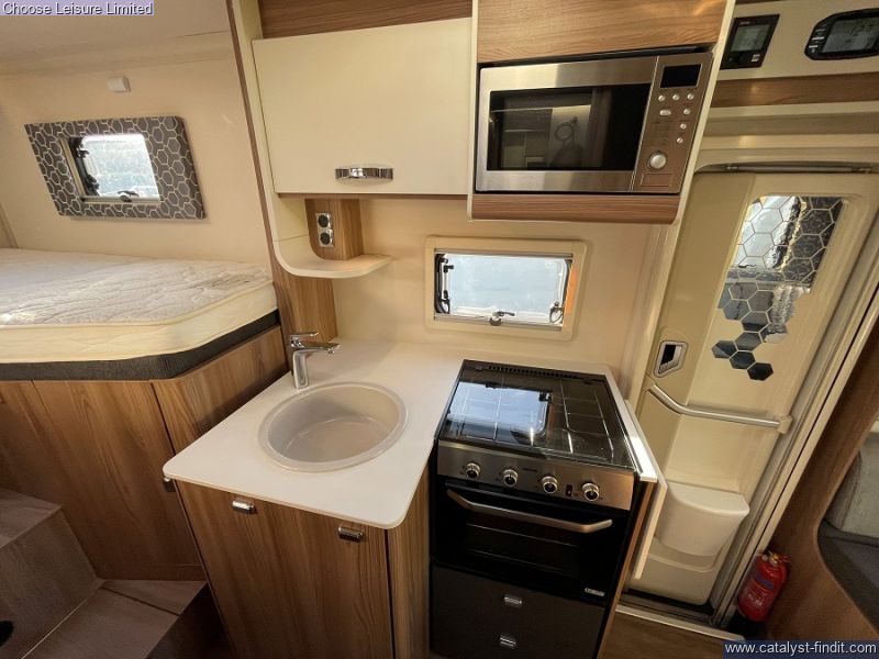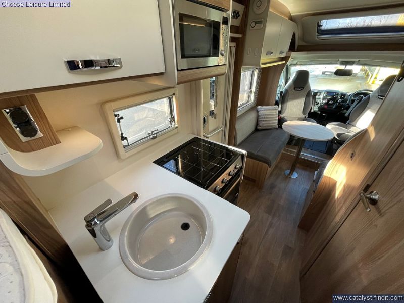 - With great features and style throughout, this motorhome is highly desirable. The social and airy lounge can seat up to six people, with swiveling front seats, a settee and L- shaped lounge with 3 extra forward facing seatbelts. The middle kitchen includes hob, oven, sink, microwave and a large fridge freezer. There is also a modern washroom with shower, toilet and sink. At the rear, unique bedroom can be made into two large single beds or a huge double bed. Technical:
