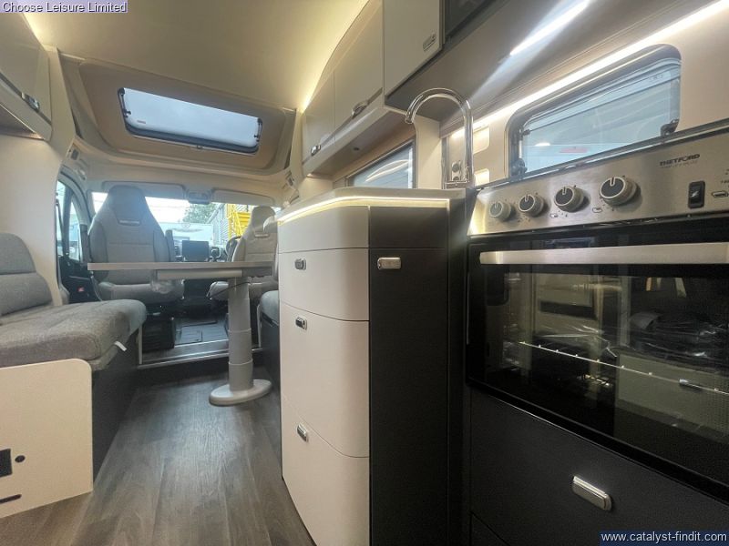 - Built with proprietary SMART construction, the Escape’s sleek profile now sits on a new Fiat chassis cab in metallic Iron Grey, featuring an updated front grill and body- coloured bumper, and is enhanced by a striking new exterior graphics scheme. Escape also features a garage space with services and interior access, plus a wide external entrance door with a window and central locking. Step inside and marvel at the revolutionised living space that enjoys a comfortable height of 2110mm and is designed with domestic-style seating in the parallel lounge. This includes space-efficient Aguti traveling seats, which incorporate cup holders and ISOfix for secure child seating, along with a rise and fall table. The stylish washroom with a dedicated shower continues to impress, featuring a Crema Bianca marble effect wallboard. The washroom has further enhanced storage which offers added storage space. In the kitchen area,Escape comes equipped with a Thetford Triplex combination oven and grill, a three-burner gas hob with an electric hotplate, and a Series 10 Dometic slim-line fridge-freezer, allowing fabulous meals to be enjoyed along the way. The kitchen also features a slate-weft laminate worktop and a Dometic flatbed microwave with digital controls. The Fiat cab now boasts an exclusive new 10” touchscreen HD color display, coupled with new Fiat Sat Nav with TomTom 3D map visualisation. This is encased within the sleek, black- trimmed dashboard design. Extra drivability is delivered via cruise control, ESC with Traction+ anti-slip regulation, hill descent control, and a new 8-speed automatic gearbox. Air conditioning, now with an automatic feature, maintains a comfortable environment, and a new wireless phone charger adds convenience. Make your great Escape today! Technical: