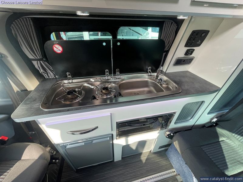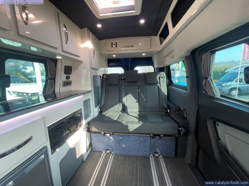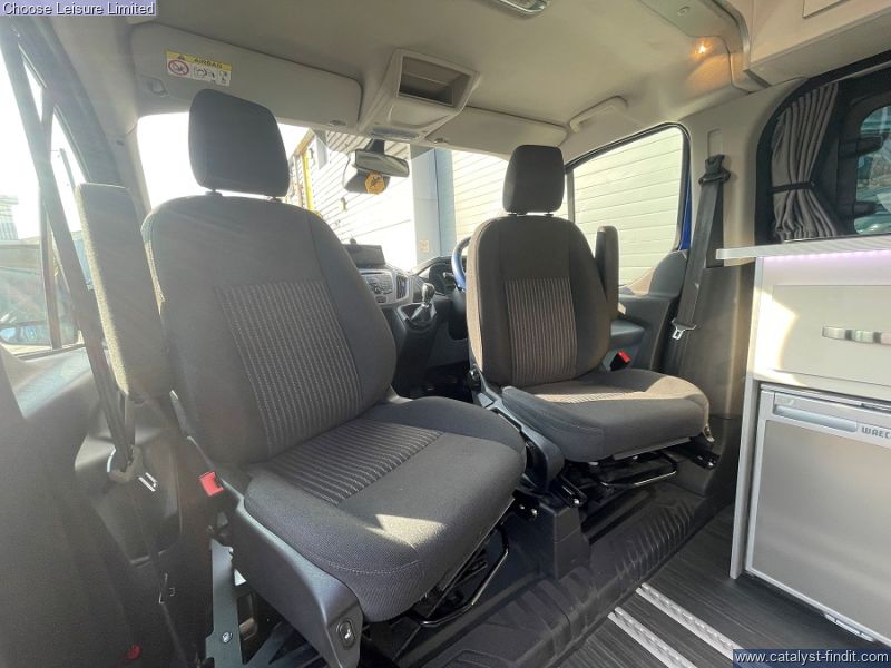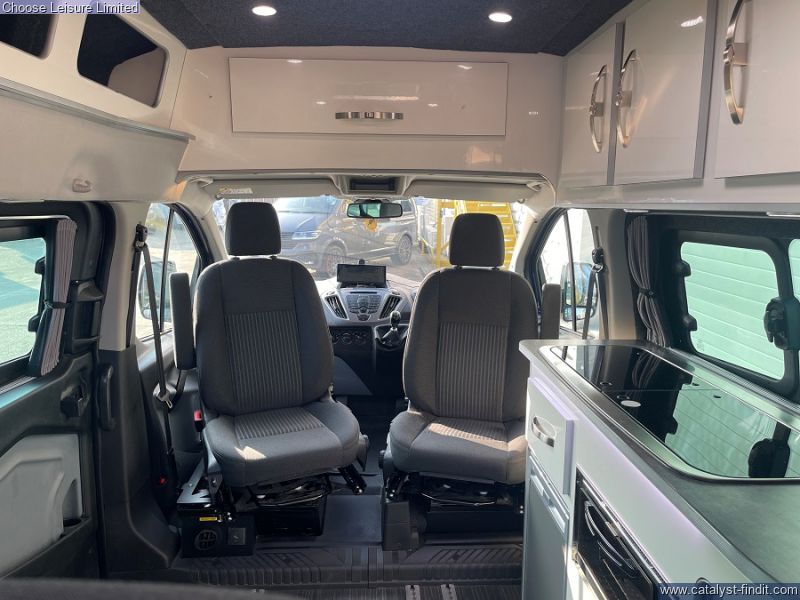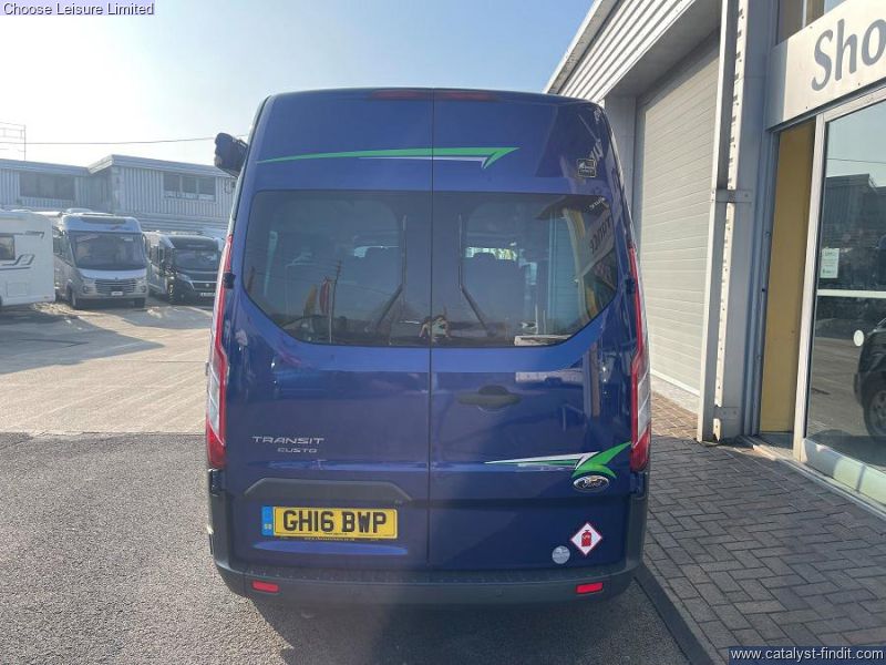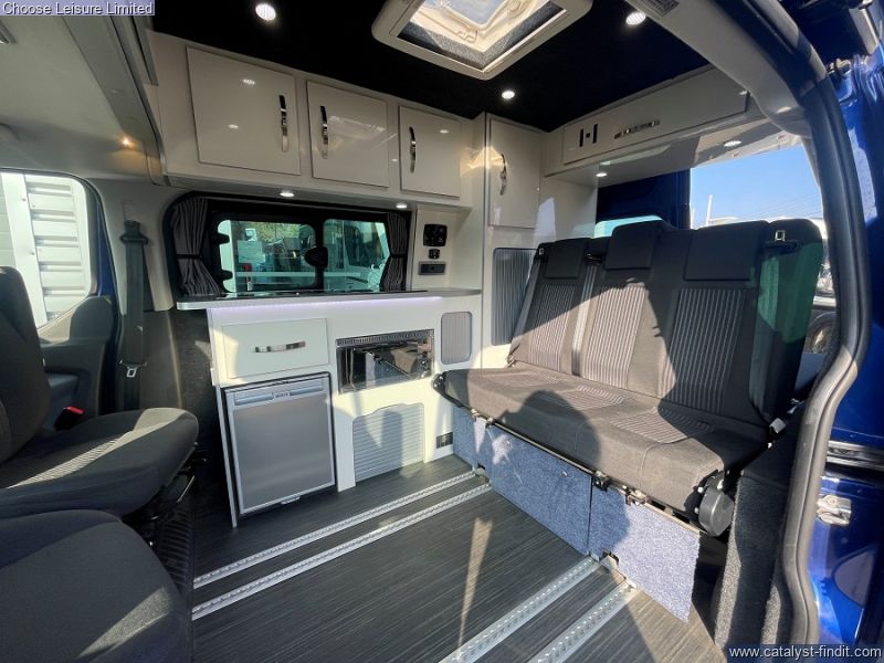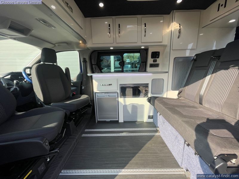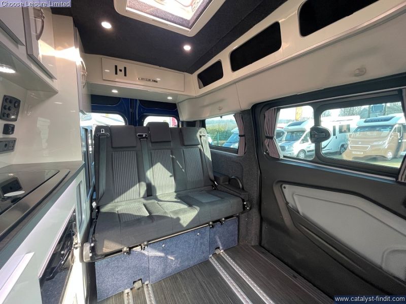 - Based on the Ford Transit Custom with a car-like handling. Providing a comfortable driving position and easy parking. The space management in this van is fantastic - almost 'tardis' like, with plenty of headroom. There are also smart features throughout such as fresh and waste water tanks on board, Eberspacher diesel heating system, heated front seats and reversing sensors. Spin the front seats and it creates a fantastic dining area for a family. The spacious rear bench has 3 extra travelling seats with seatbelts. Push the bench right back, flip it down and it creates a double bed which is very comfortable for two adults. There are smart storage solutions and neat cubbies with locking lids everywhere. There is a sink, fridge, and plenty of room to stand up, move around and cook on the standard-fit two-ring gas hob. There is also plenty of luggage space behind the rear bench. Technical: