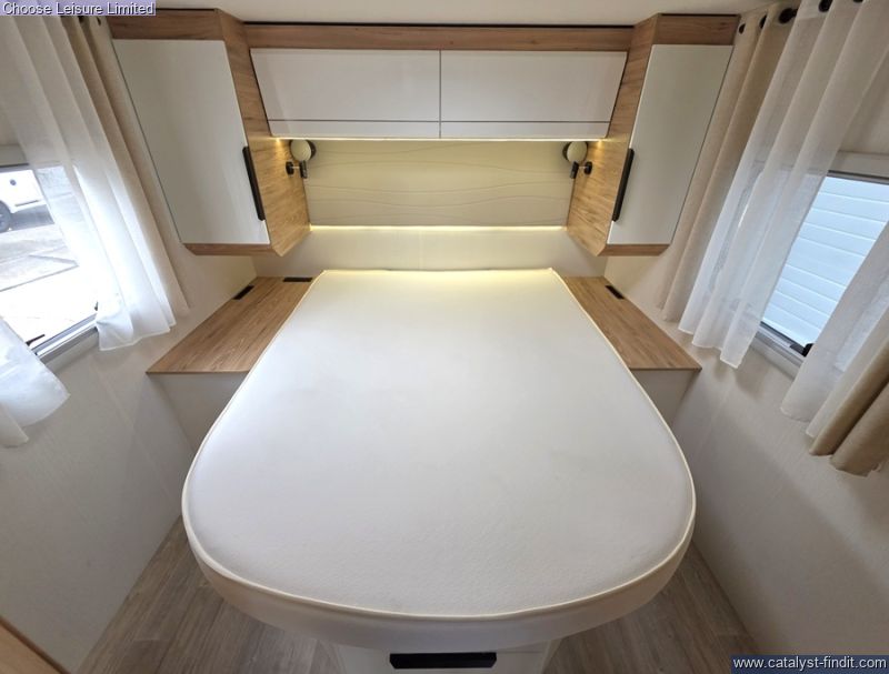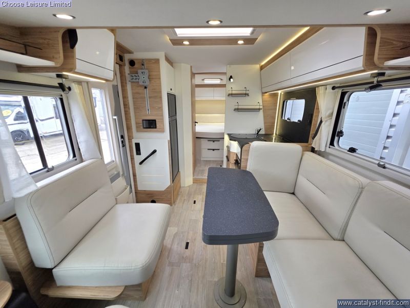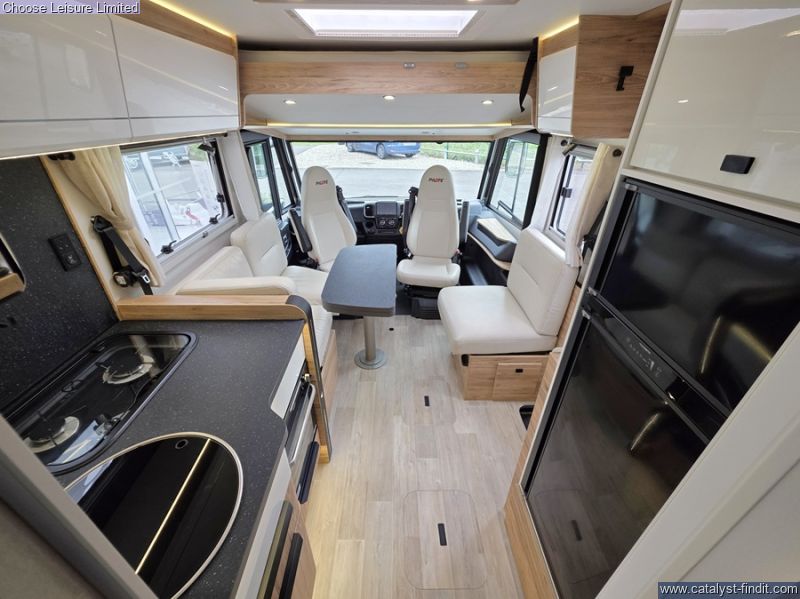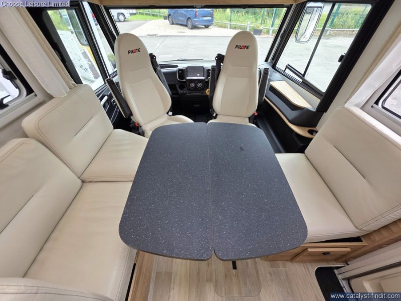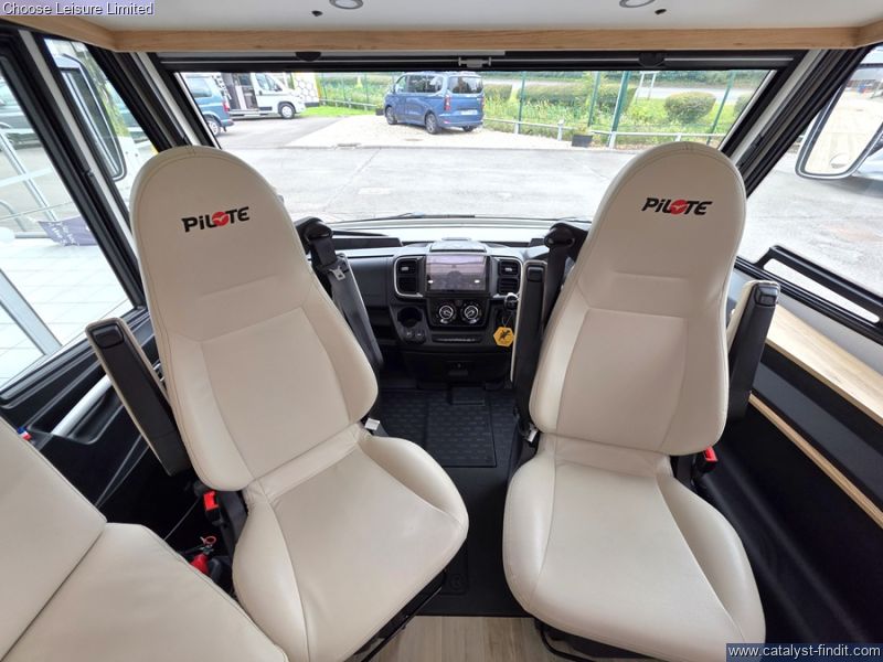 - With the Pilote G740FC motorhome, you'll have cleverly designed space and smooth handling, making it the ideal companion for unique getaways. Embark on a journey to discover new horizons and let yourself be captivated by the spirit of adventure in complete tranquility. This integrated Pilote motorhome invites you to experience memorable moments and explore the world with ease. Offering a very liveable layout and ease of movement throughout. Its large island bed (150 cm), bathroom with double partition and face-to-face lounge for 5 people make this A-Class a safe bet. Two large bench seats face each other in this beautifully finished living room. In the centre, a large folding table seats 5. The elegance of the wood, the large windows and the numerous LED lights all contribute to the warm ambience of this beautiful living space. Elegant and functional, the kitchen features an L-shaped worktop and a three-burner hob opposite the compression refrigerator. With plenty of storage space, drawers and pots and pans, you'll have plenty of equipment to cook with every day. This vehicle features a comfortable shower separate from the bathroom. Sliding partitions close it off from the bedroom and lounge, giving you a perfectly private space. The comfort of this bedroom is partly due to the large 150 x 190 cm central bed with high resilience mattress and slatted base. The fluid flow around the bed gives easy access to the wardrobes. The sockets at the head of the bed, the bedside tables and the extensive lighting all contribute to the quality of life in this room. The separate storage hold allows you to store your belongings safely. As an option, choose the electrically height-adjustable storage area. It's perfect for gaining even more storage space in the garage and transporting tall and bulky items. The doors are equipped with double compression latches which provide an air- and water- tight seal. Technical: