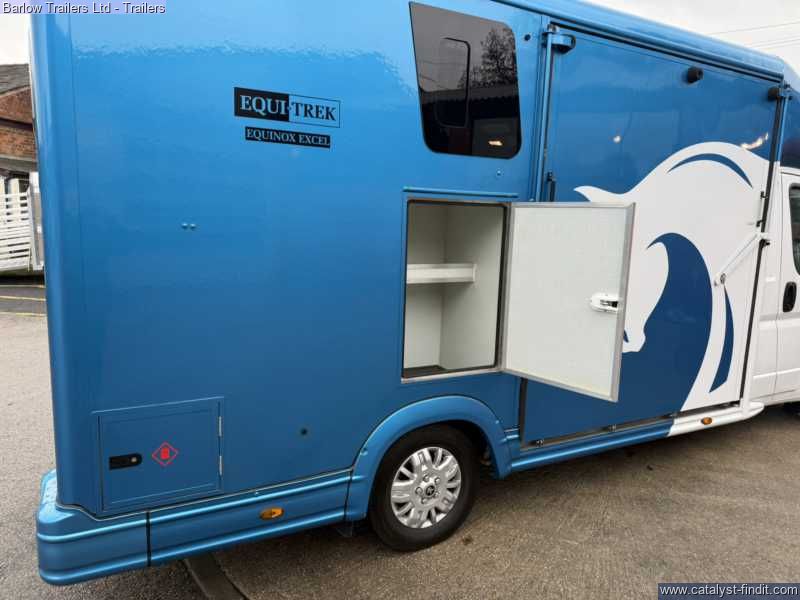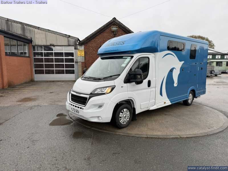 Barlow Trailers are pleased to offer !Equinox Excel 3500 kg! Get ready for the new season. compact, easy to drive horsebox, with a gross maximum weight of 3,500kg, meaning it can be driven by anyone with a standard car license. The Equinox is powered by a powerful HDI diesel engine which complies with the latest emission standards, giving effortless performance and outstanding economy. The Equinox has the added benefit of a tack and changing area that is totally separate from the horses.There is also additional storage over the cab. ColourPeugeot White/ Moraine Blue Excel Pack. Enhances your horsebox, including many of our most popular extras, as well as some unique features: Mud Flaps (Front Wheels), Two Tone Paint including Horse Graphics and Colour Match Bumpers, Horse Area Camera, Reversing Camera, Extra Height Partition, Padding for Partition, Seat with Storage, Vanity Mirror Additional Spec- Cruise control DAB radio Skylight Roof Vent Flettner 2000 Roof Ventilator Flush Glazed Windows Grooms Locker Mud Flaps (Rear Wheels) Tack Locker Full Height Bulkhead Composite High ImpaBarlow Trailers are pleased to offer !Equinox Excel 3500 kg! Get ready for the new season. compact, easy to drive horsebox, with a gross maximum weight of 3,500kg, meaning it can be driven by anyone with a standard car license. The Sonic is powered by a powerful HDI diesel engine which complies with the latest emission standards, giving effortless performance and outstanding economy. The Sonic has the added benefit of a tack and changing area that is totally separate from the horses. This incorporates two saddle racks, two bridle racks and two coat hooks. There is also additional storage over the cab. ColourPeugeot White/ Moraine Blue Excel Pack. Enhances your horsebox, including many of our most popular extras, as well as some unique features: Mud Flaps (Front Wheels), Two Tone Paint including Horse Graphics and Colour Match Bumpers, Horse Area Camera, Reversing Camera, Extra Height Partition, Padding for Partition, Seat with Storage, Vanity Mirror Additional Spec- Cruise control DAB radio Skylight Roof Vent Flettner 2000 Roof Ventilator Flush Glazed Windows Grooms Locker Mud Flaps (Rear Wheels) Tack Locker Full Height Bulkhead Composite High Impact Kick Boards Composite Panels Full Width Collapsible Breast Bar Grooms Doors Between Horse Area and Living Area Head Divider LED Interior Light Light and Spacious Interior Safety Loading Doors Strong Aluminum Plank Floor with Dunlop Rubber Strong, Adjustable Partitions with PVC Skirt Two Horse and Two Hay net Tie Rings Padding for Partition Extra Height Partition Hard Wired Camera with 7” Monitor and Reversing Camera Storage Over Pod with Door Full Height Ramp Payload 1100kg £63999 inc Vat.ct Kick Boards Composite Panels Full Width Collapsible Breast Bar Grooms Doors Between Horse Area and Living Area Head Divider LED Interior Light Light and Spacious Interior Safety Loading Doors Strong Aluminum Plank Floor with Dunlop Rubber Strong, Adjustable Partitions with PVC Skirt Two Horse and Two Hay net Tie Rings Padding for Partition Extra Height Partition Hard Wired Camera with 7” Monitor and Reversing Camera Storage Over Pod with Door Full Height Ramp Payload 1100kg £63999 inc Vat.